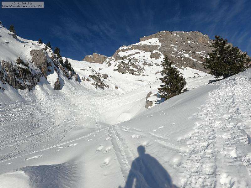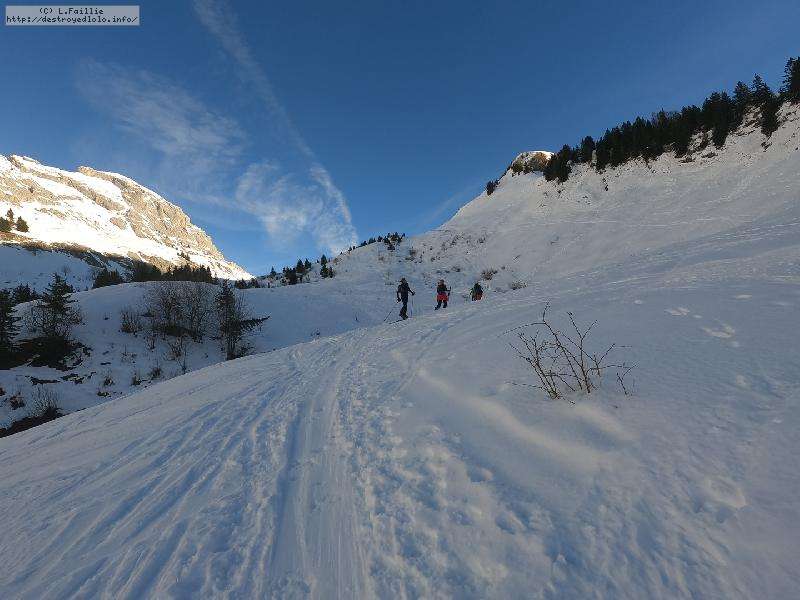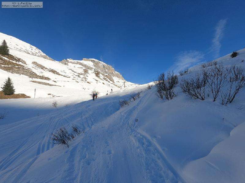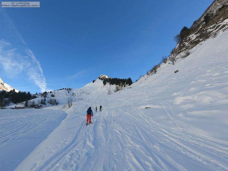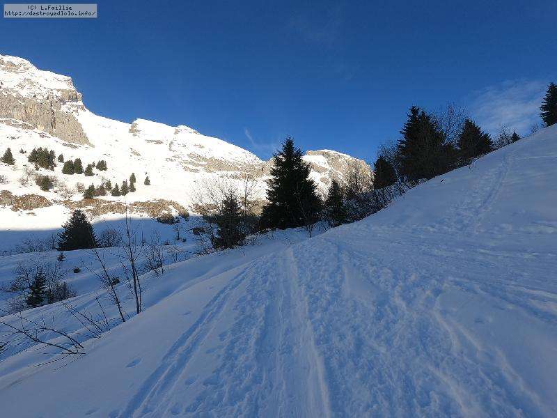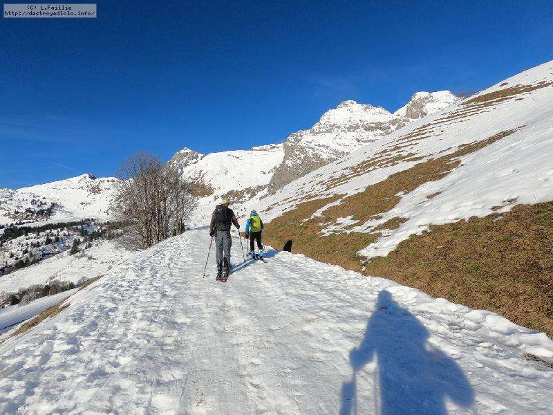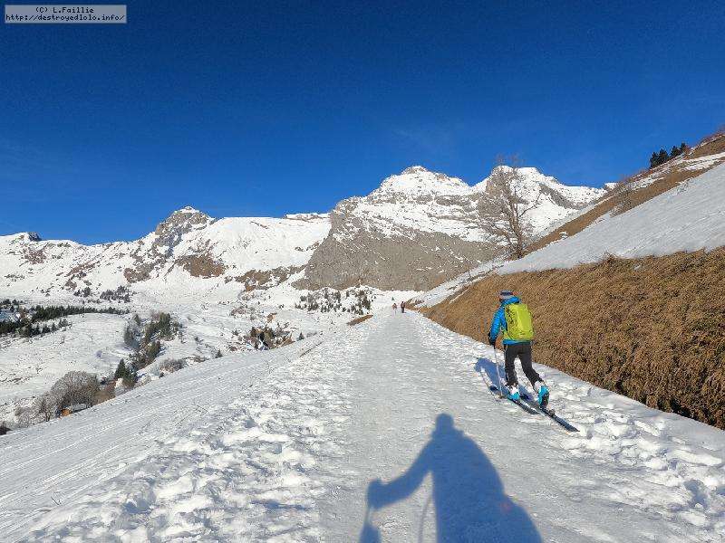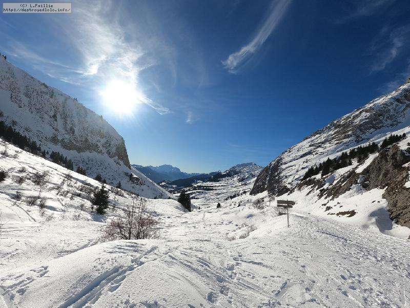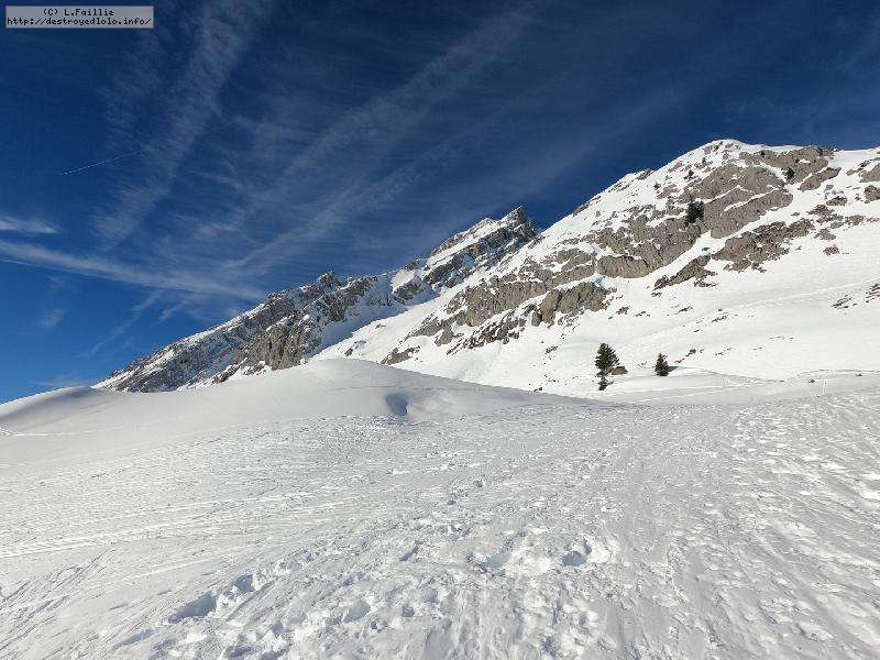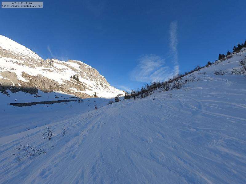 Lorsqu'il est enneigé, le Col de la Colombière est fermé et c'est de la fin de la route dont nous partirons, à la Sonnerie (bon courage pour s'y garer). Importante couche de ... glace : aucun risque que les skis s'abiment sur des requins ... mais les conditions de glisse s'en ressentent.