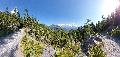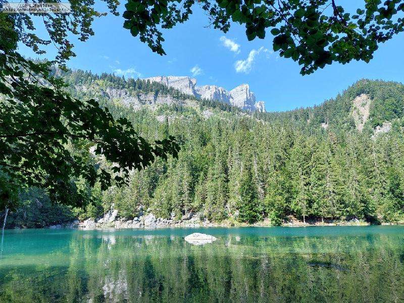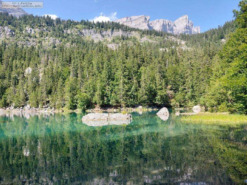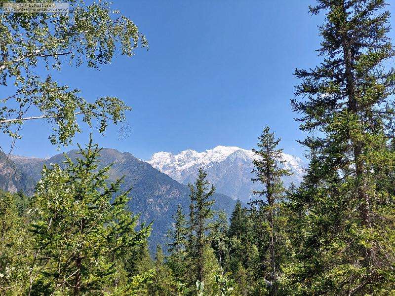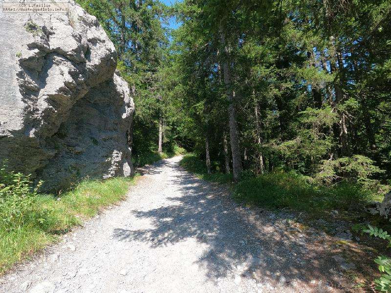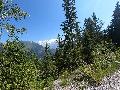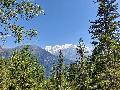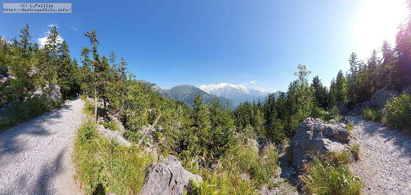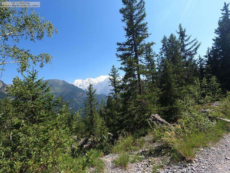 La foret s'ouvre à la faveur d'un éboulement rocheux, offrant une superbe vue sur le Mont Blanc.