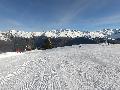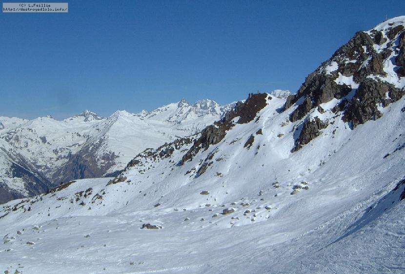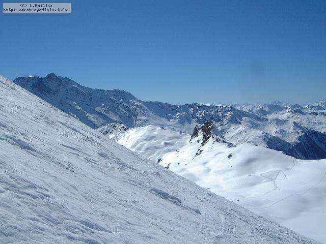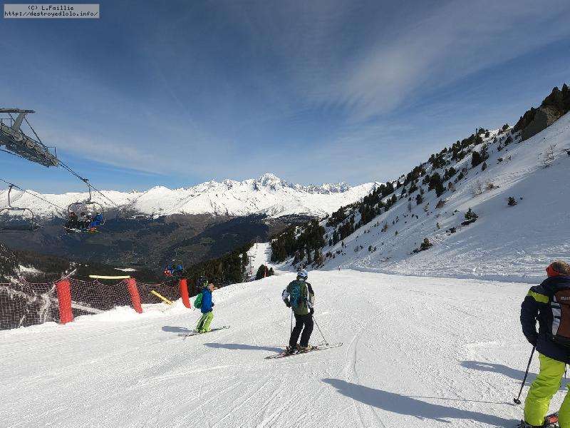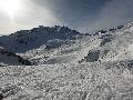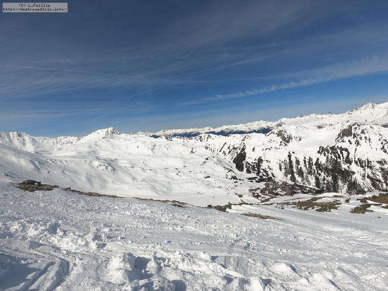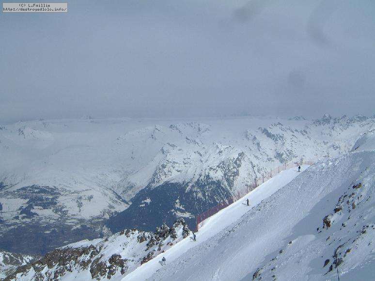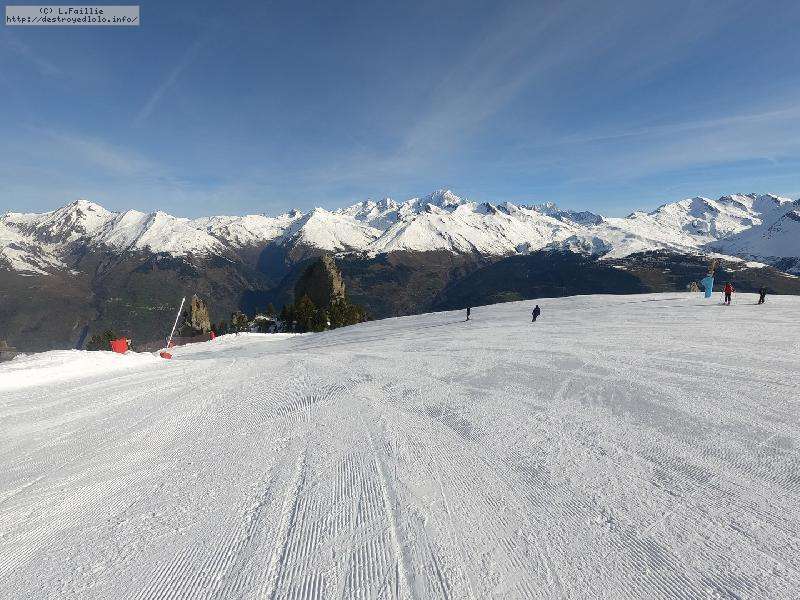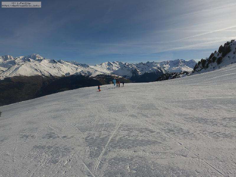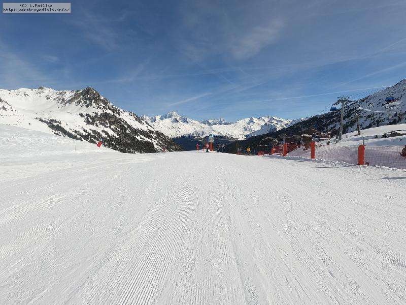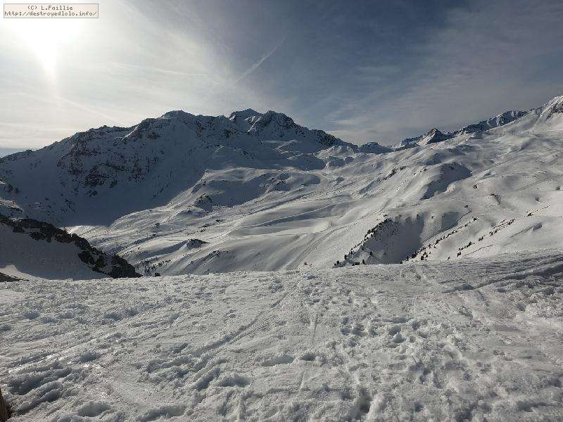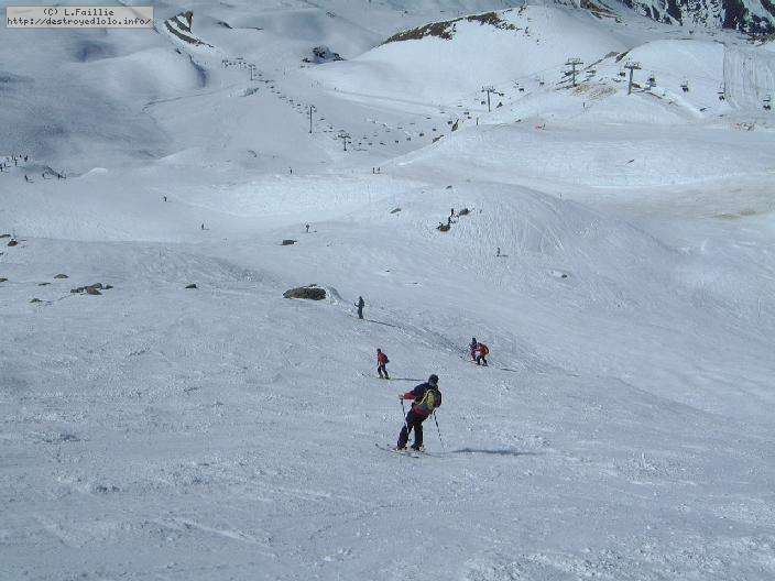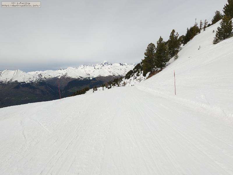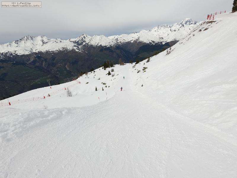 Descente sur Villaroger ... enfin presque : notre périple s'arrête en bas du plan des Violettes, car le bas est fermé par manque de neige. Et même s'il faut faire attention aux plaques de terre sur le bas de la rouge, la soupe y reste excellente.