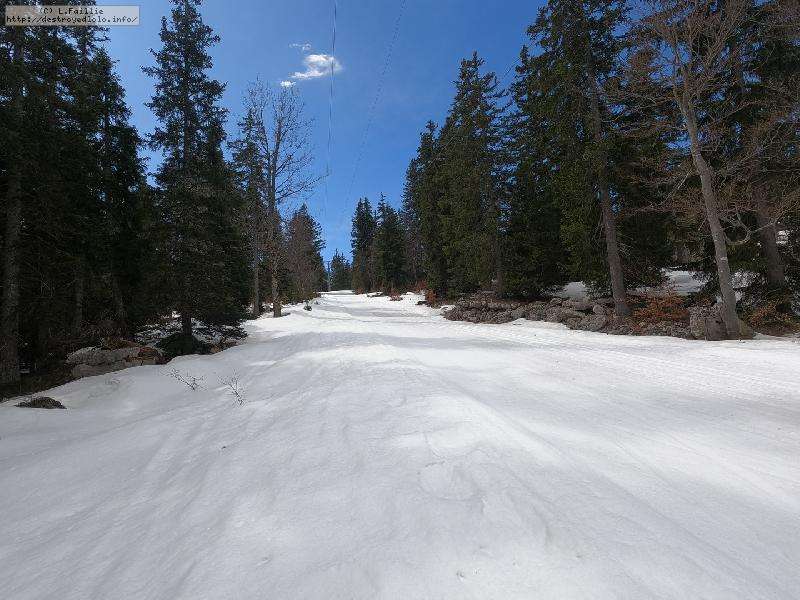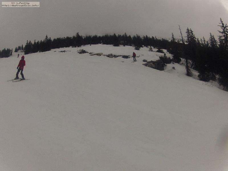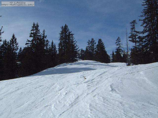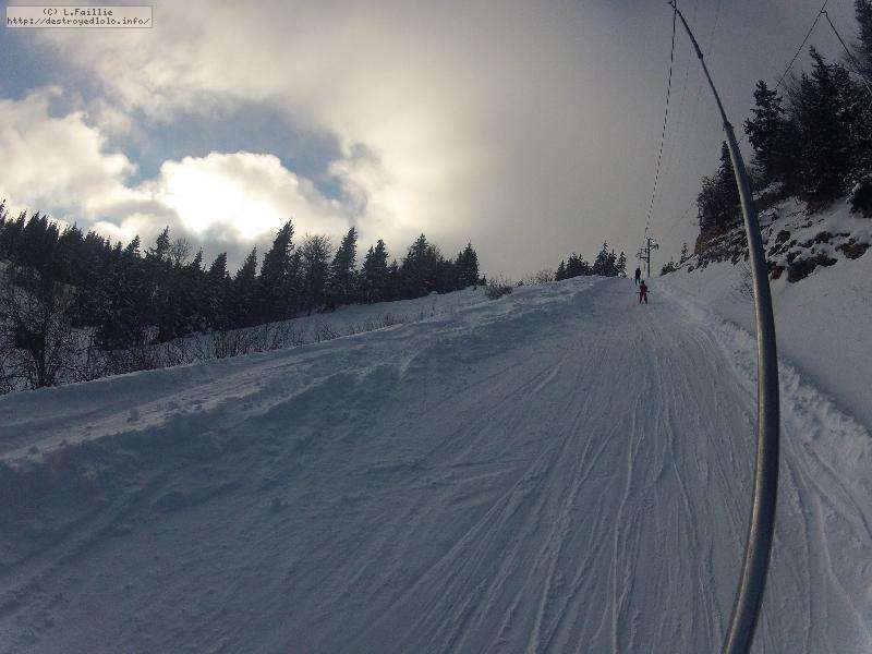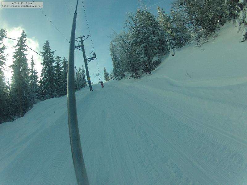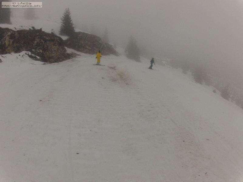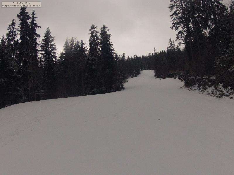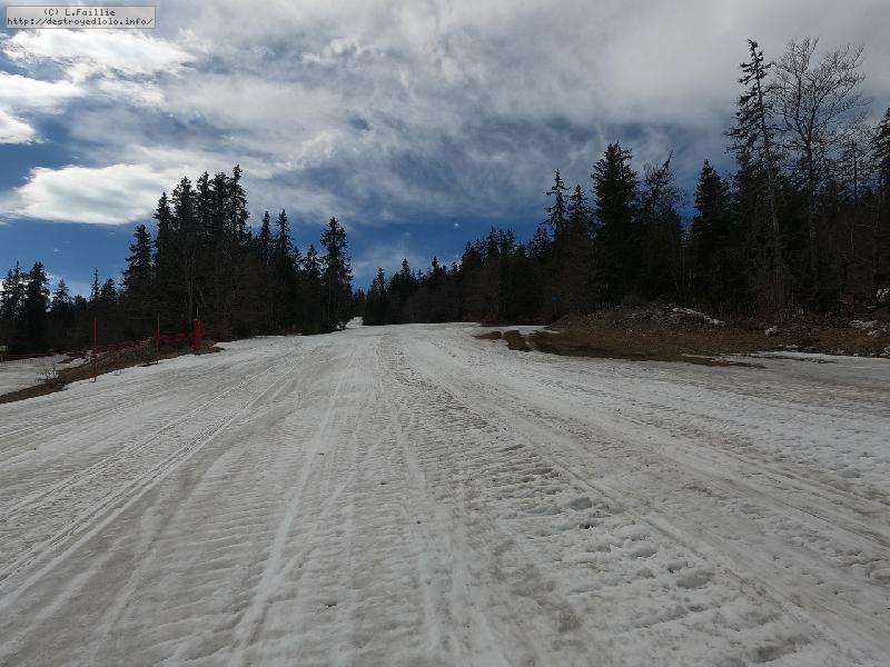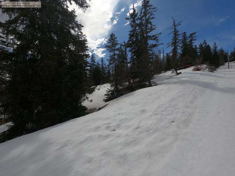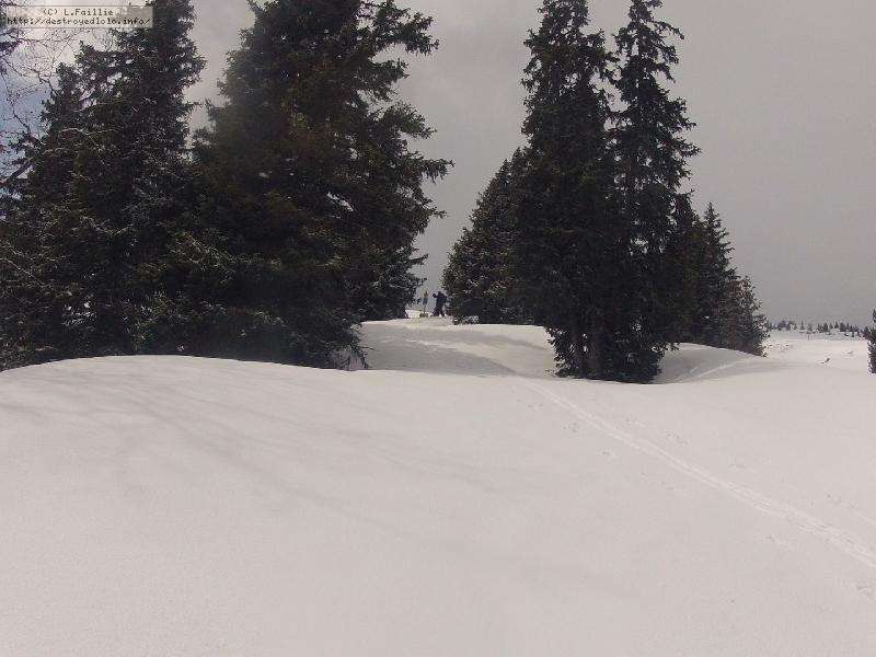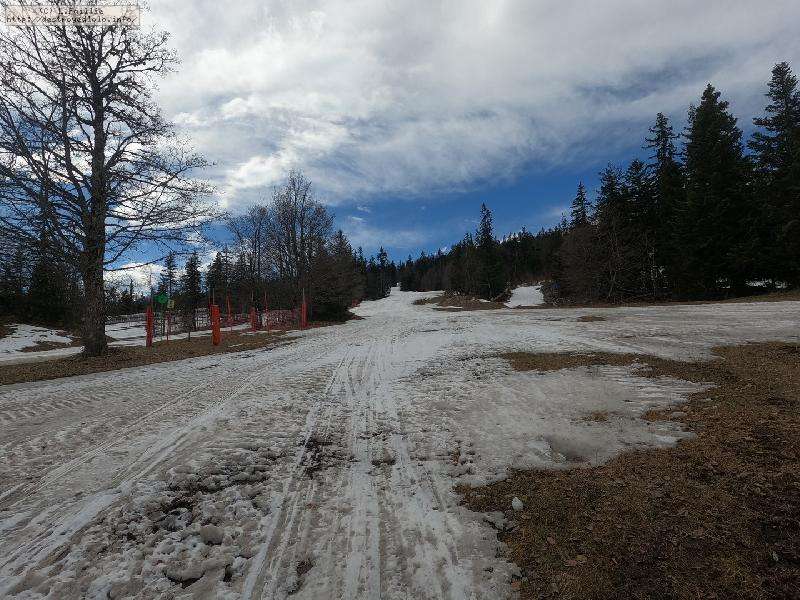 Au niveau de la "station", ca devient vraiment très limite (1ere photo), mais c'est vraiment le seul endroit. Mais après 50 ou 100m, la couche sur piste devient plus que correcte, et a peu prêt à 1/3 de la monté, on peut même s’aventurer dans les sapins : franchement inespérés.