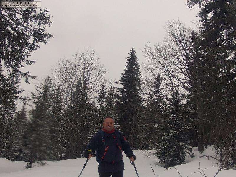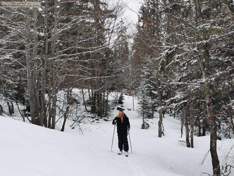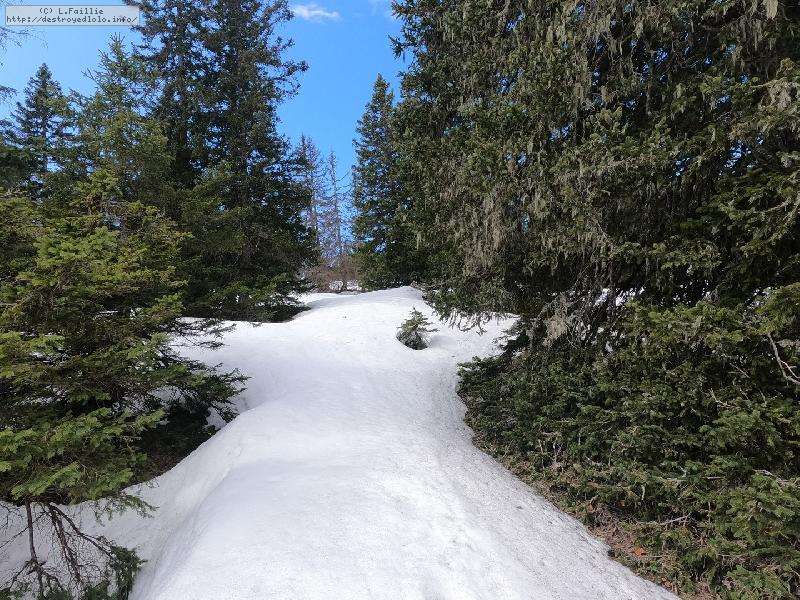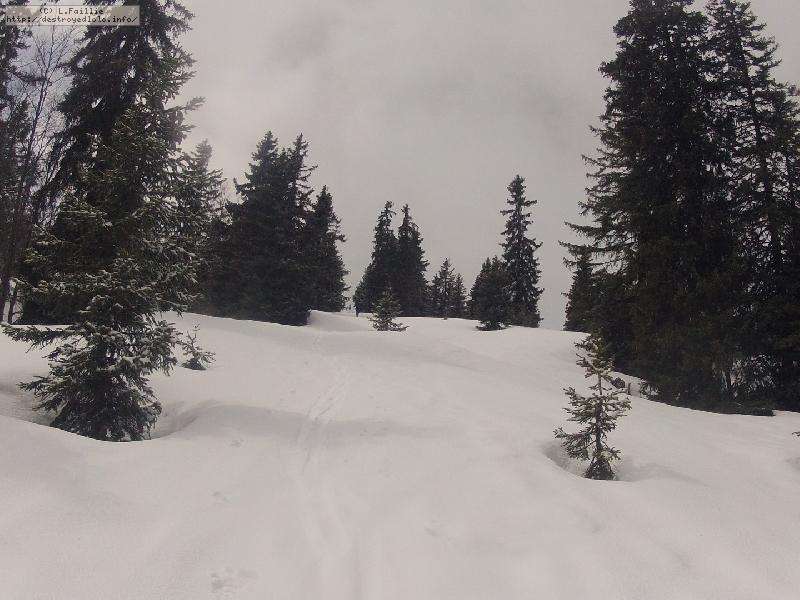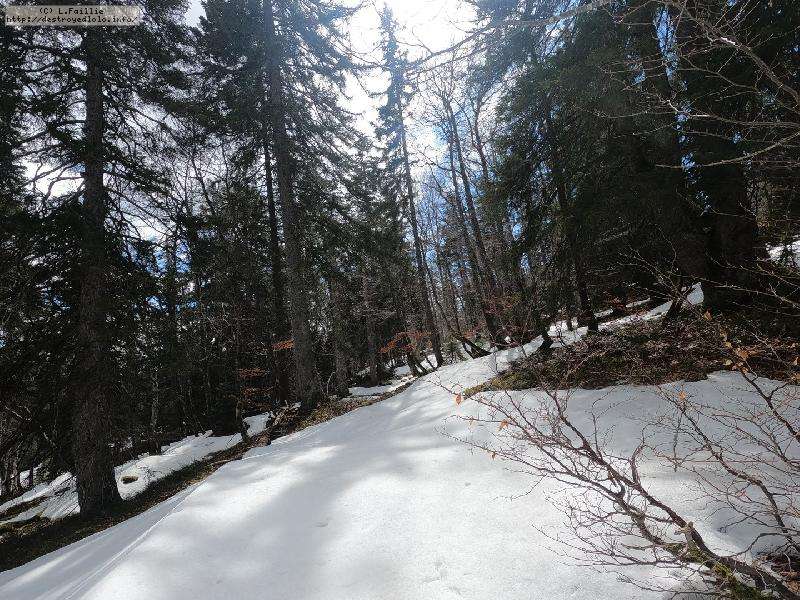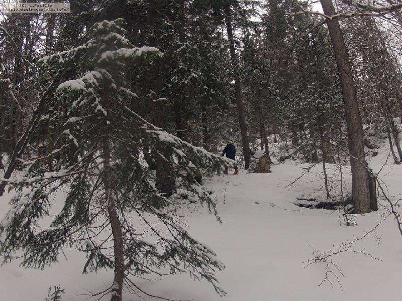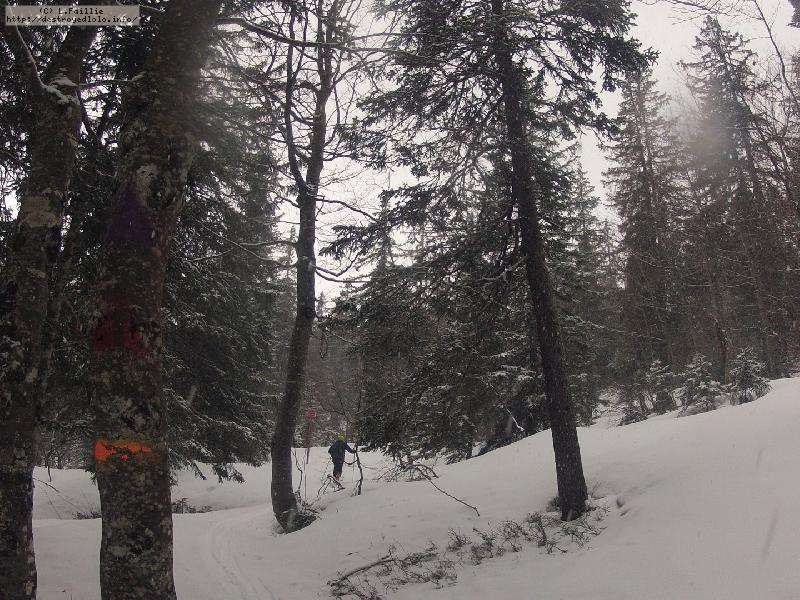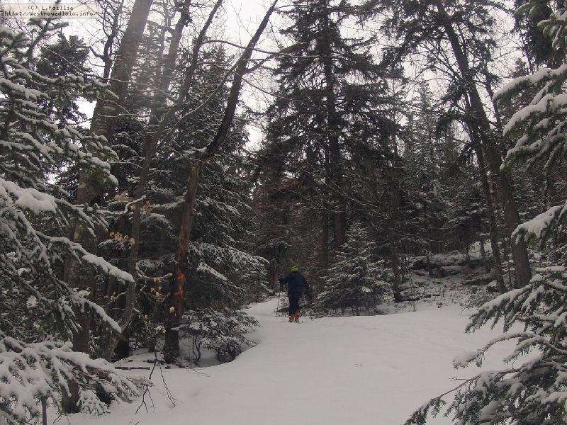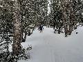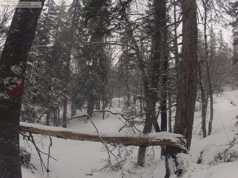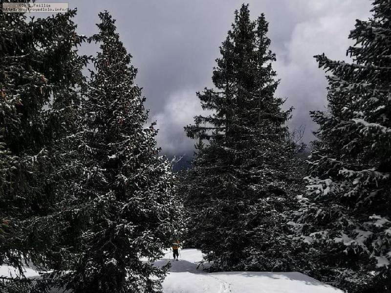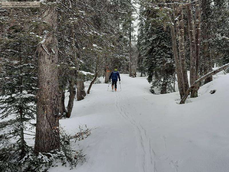 Bonne surprise, la piste qui serpente à travers la forêt reste praticable : la montée, relativement douce, se fera sous les flocons. Et comme il ne reste aucune trace de passages, il nous faudra parfois chercher où est l'itinéraire : c'est l'aventure