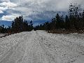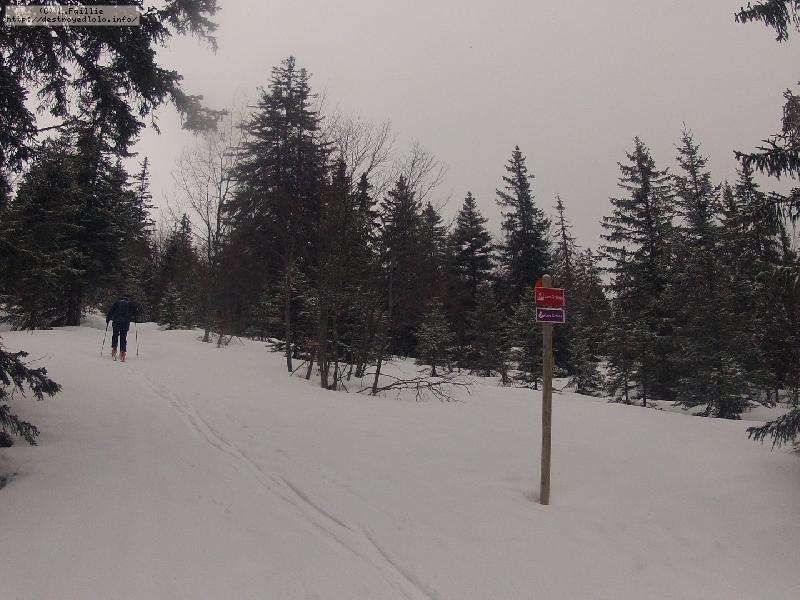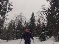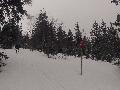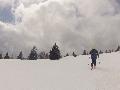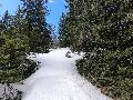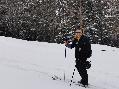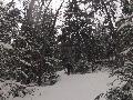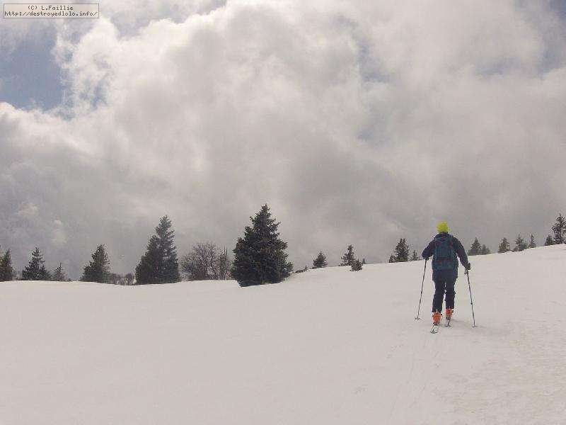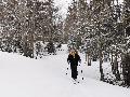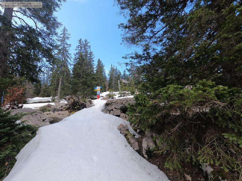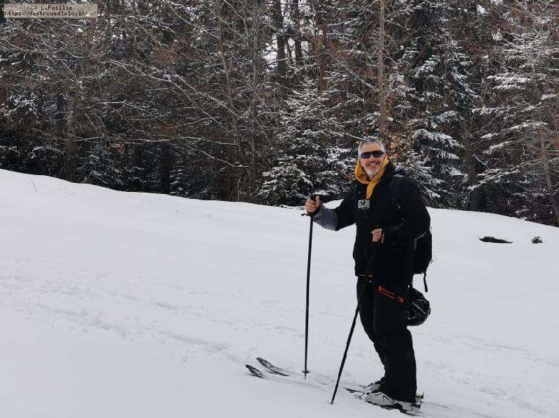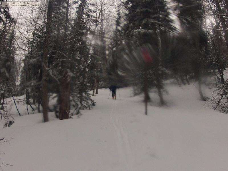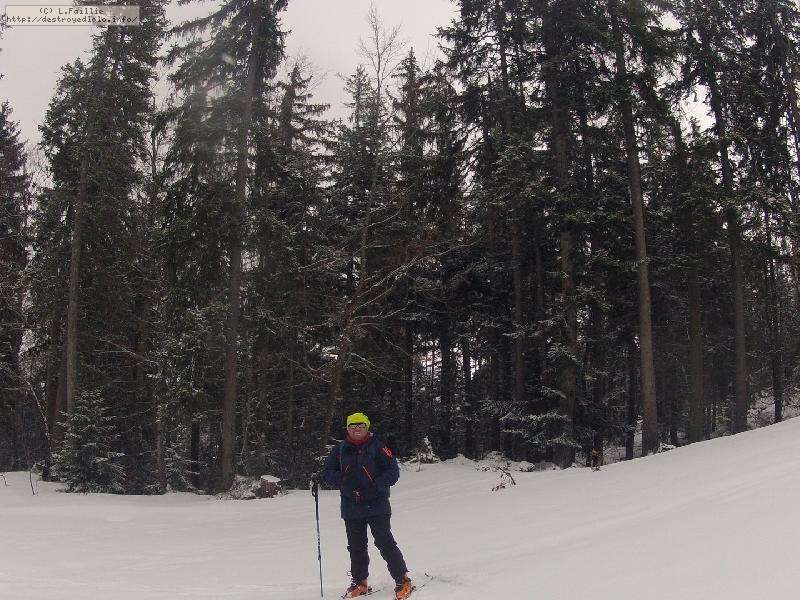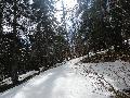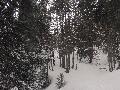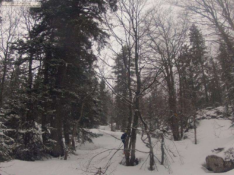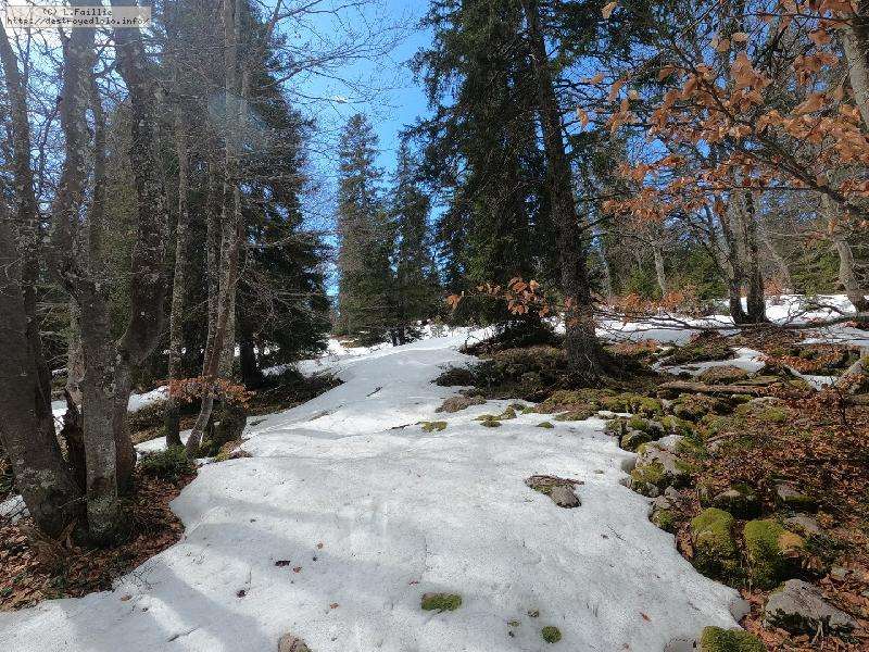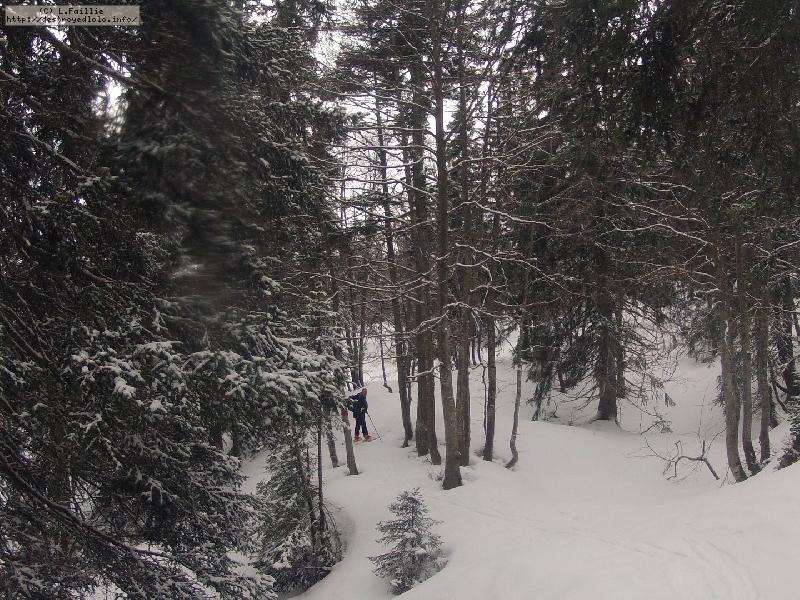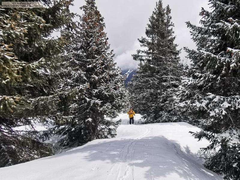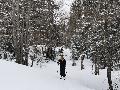 Bonne surprise, la piste qui serpente à travers la forêt reste praticable : la montée, relativement douce, se fera sous les flocons. Et comme il ne reste aucune trace de passages, il nous faudra parfois chercher où est l'itinéraire : c'est l'aventure