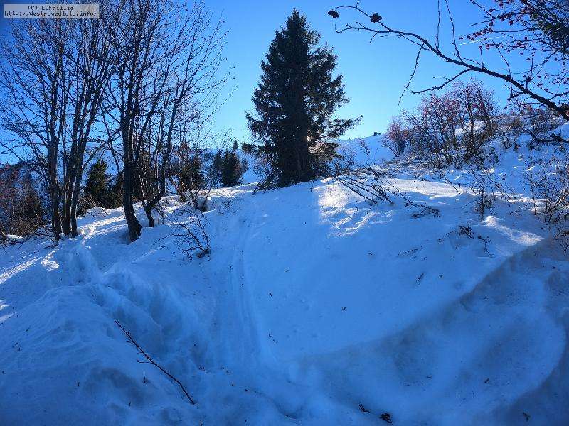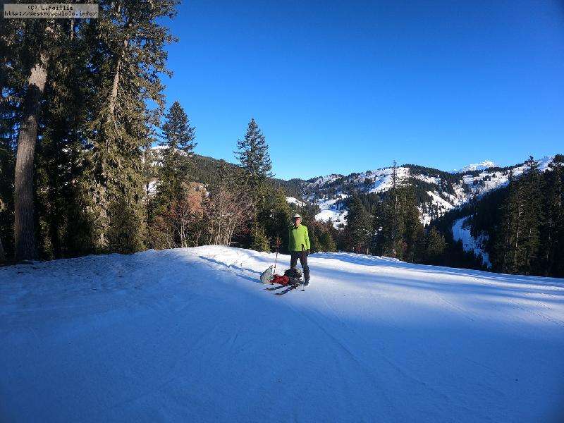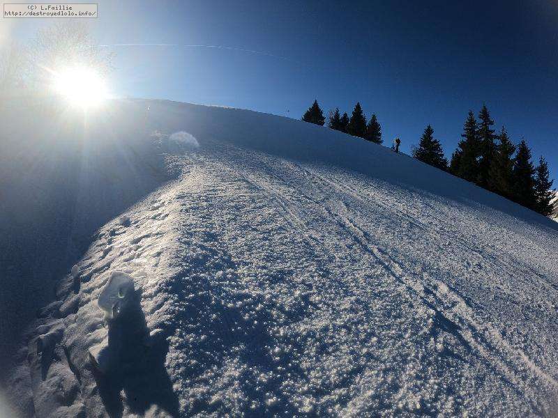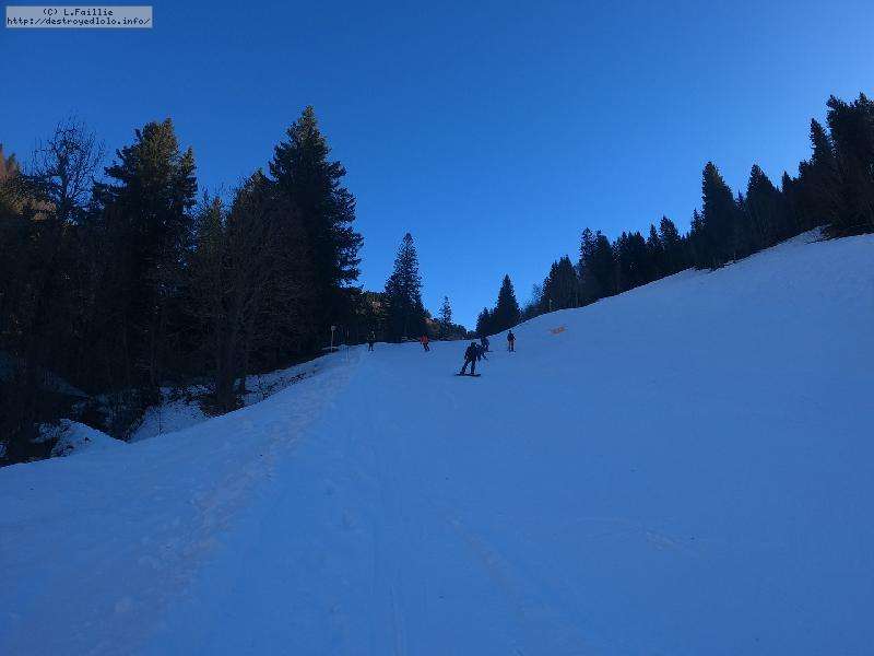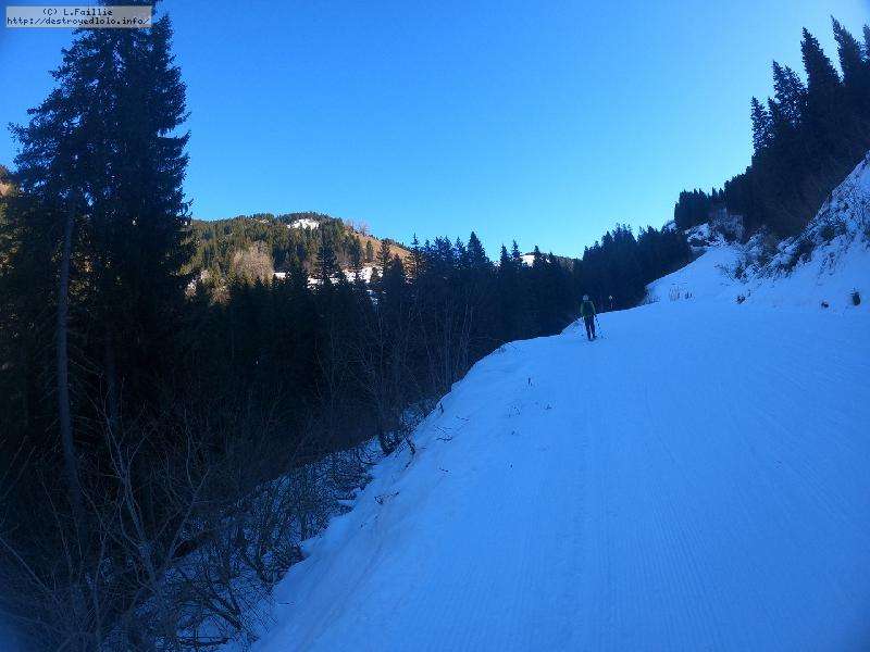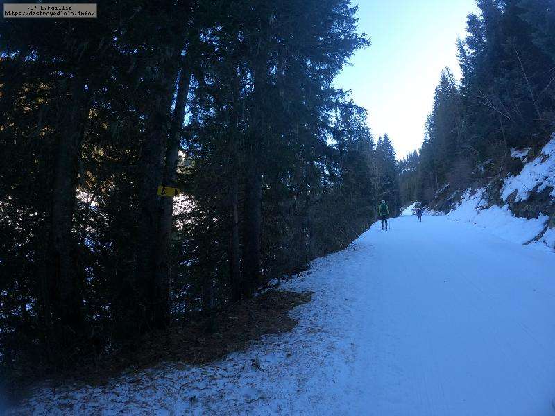 Bref, départ du plan à 11h bien tassée ... à l'image de la "neige" réduite à une couche de glace bien compacte. Dans ces conditions, totalement impossible de sortir des pistes (car oui, la trace rando est sur le bord des pistes).