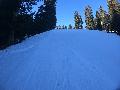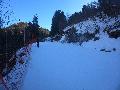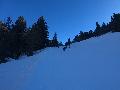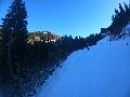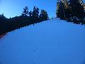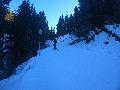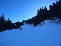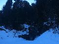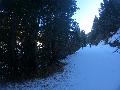 À peut-prêt à mi-pente, la neige devient plus présente et on peut commencer à s'aventurer entre les sapins, en haut, comme on peut le voir sur les photos, la neige est compacte, mais plus de terre. Par contre, elle est vraiment gorgée d'eau et relativement lourde. Les précipitations de la nuit dernière n'ont laissé qu'un tout petit centimètre.