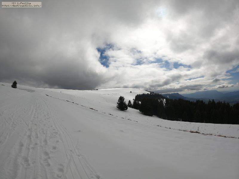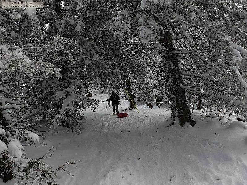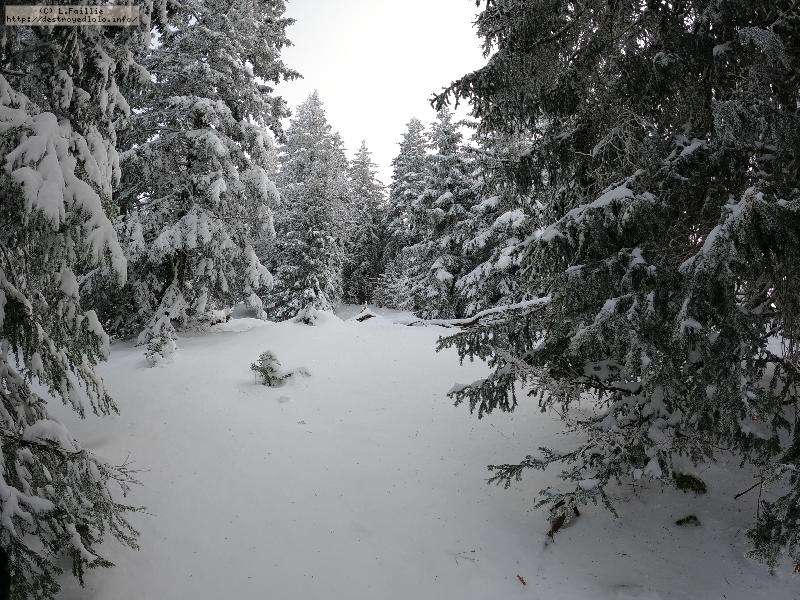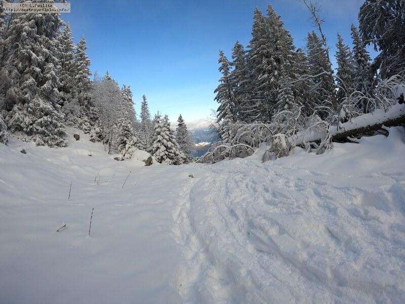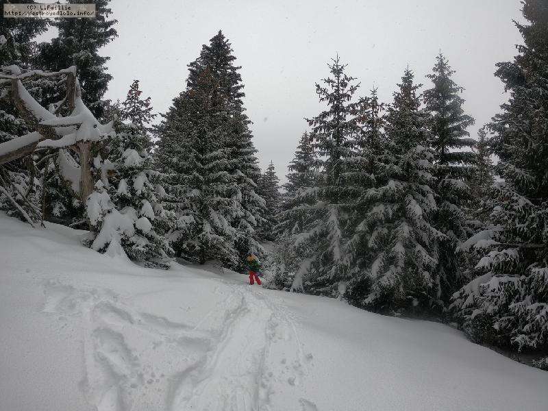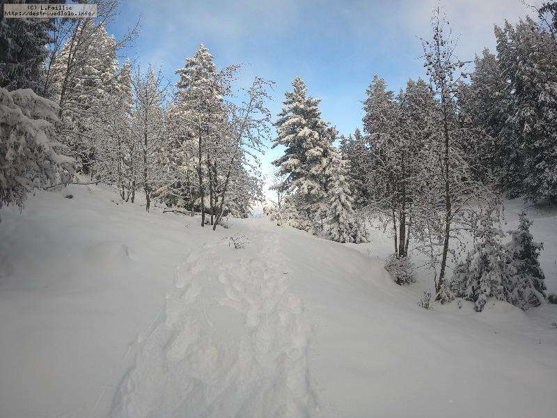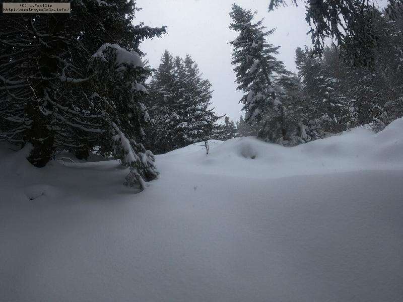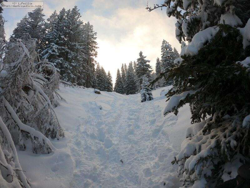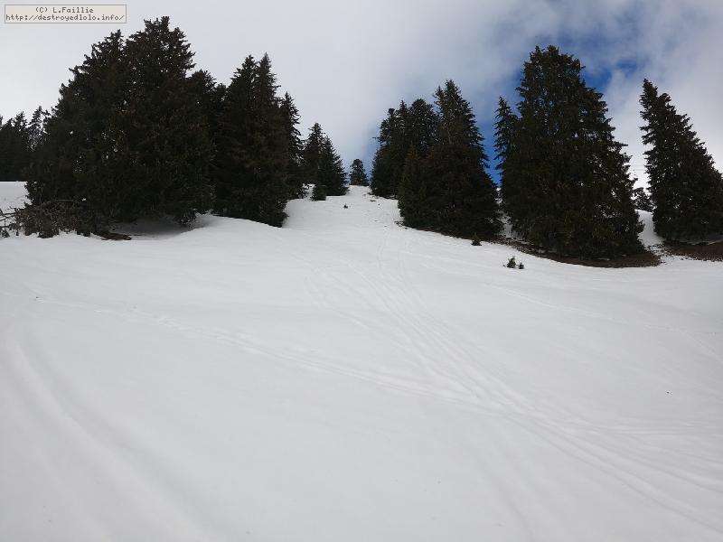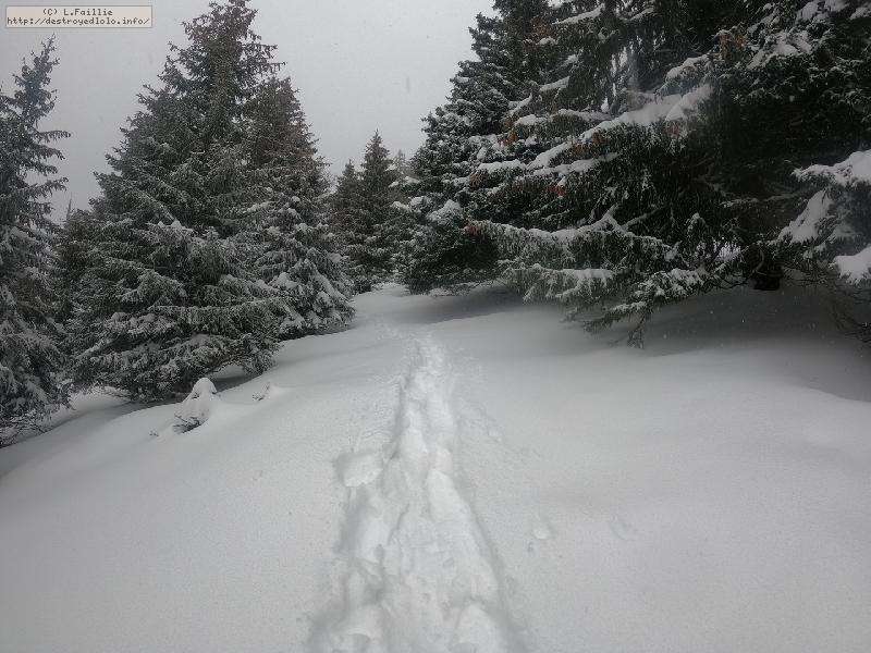 Départ du parking du côté Bauges : ainsi le plus gros de la pente est à faire au départ, monté dré dans l'pentu entre les sapins. La neige a beaucoup reçue, c'est de la soupe et ça affleure pas mal dès qu'il y a de la pente entre les sapins et elle a tendance à fuire sous les skis. Mais elle reste agréable à tracer et pas trop fatigante.