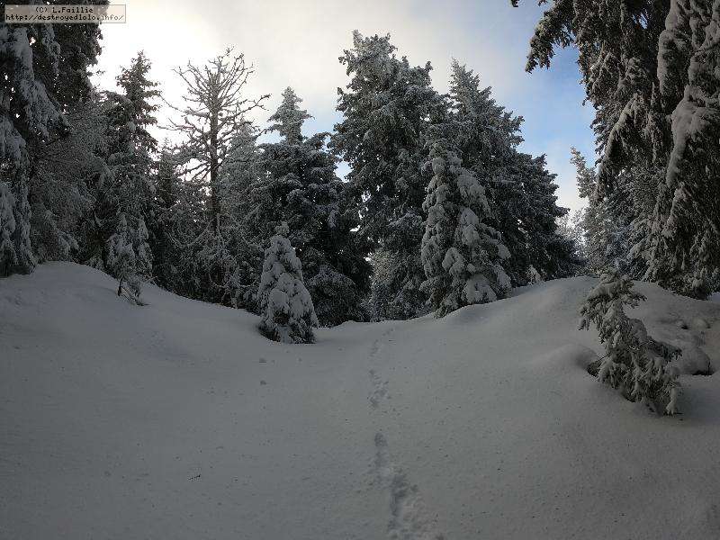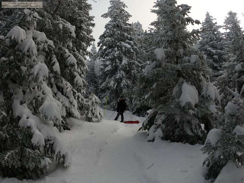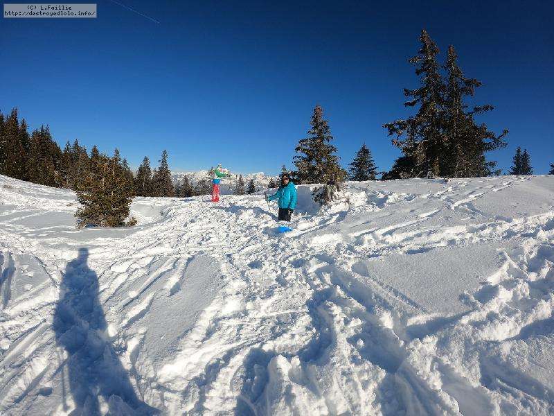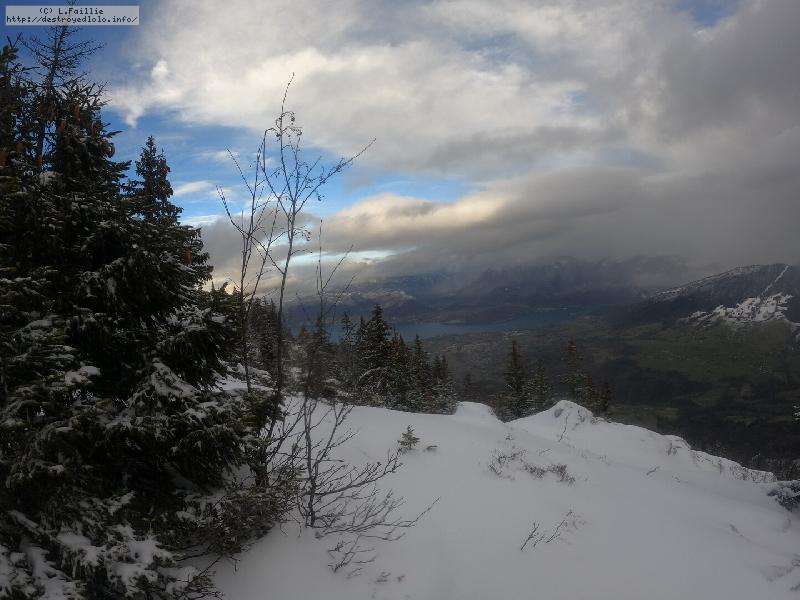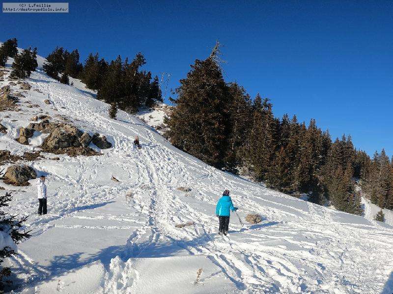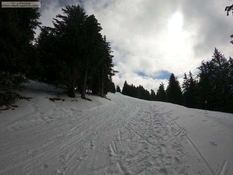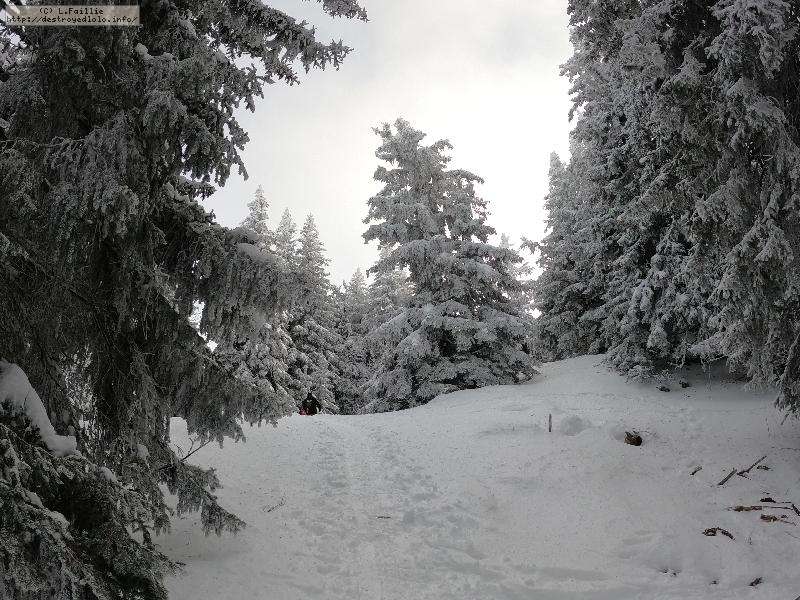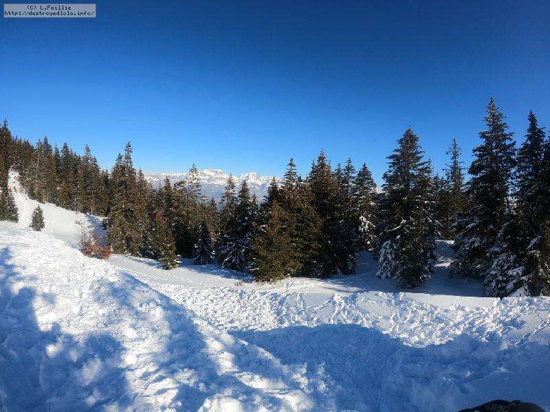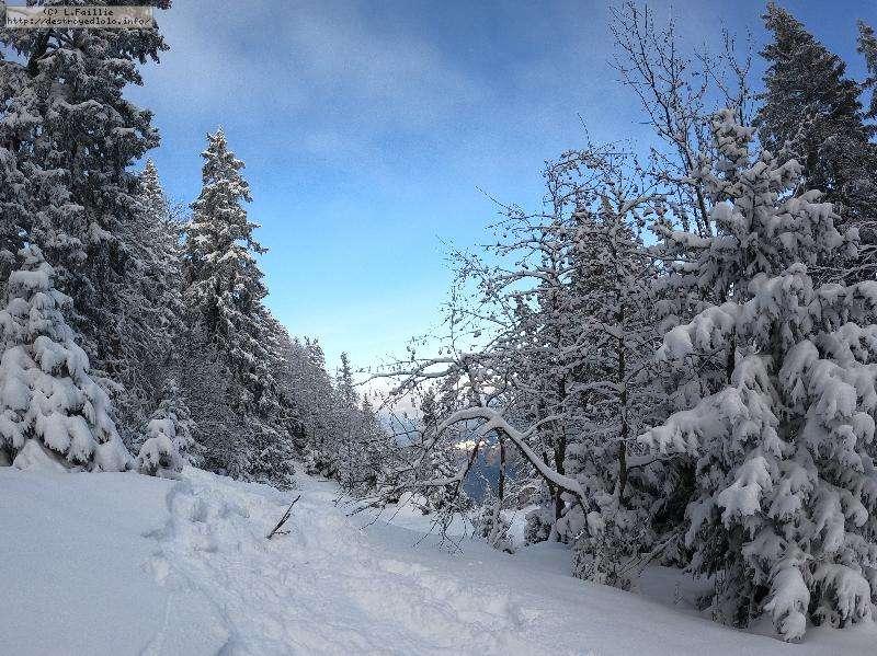 Départ du parking du côté Bauges : ainsi le plus gros de la pente est à faire au départ, monté dré dans l'pentu entre les sapins. La neige a beaucoup reçue, c'est de la soupe et ça affleure pas mal dès qu'il y a de la pente entre les sapins et elle a tendance à fuire sous les skis. Mais elle reste agréable à tracer et pas trop fatigante.