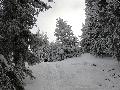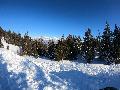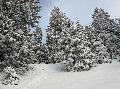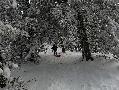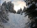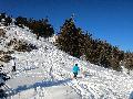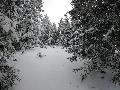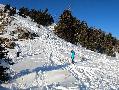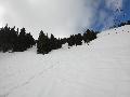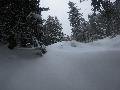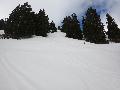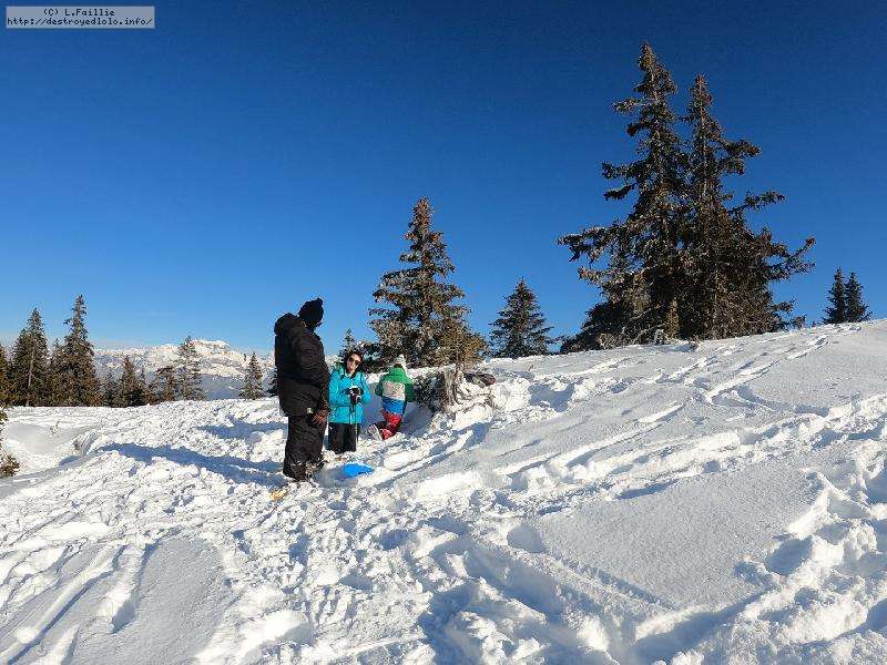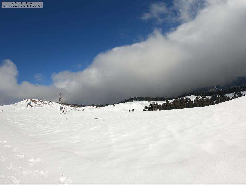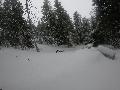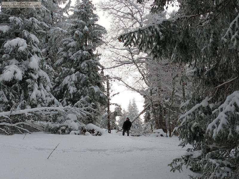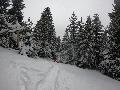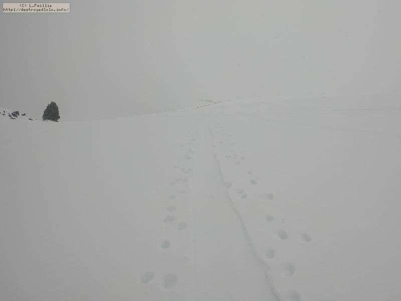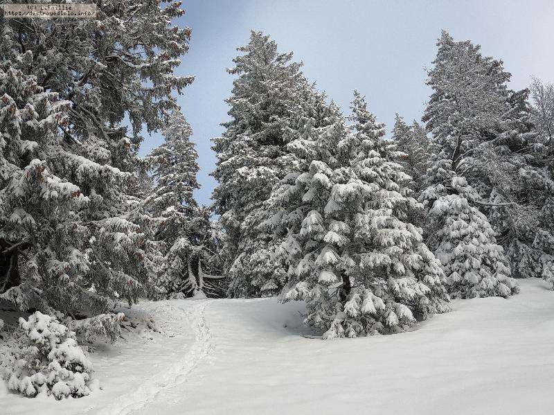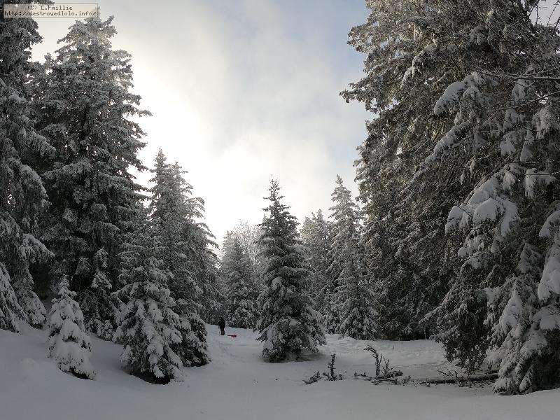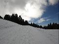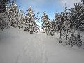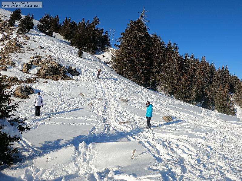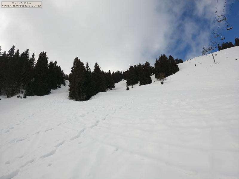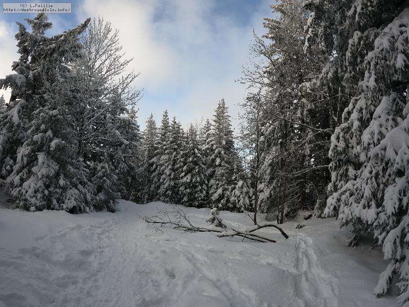 Départ du parking du côté Bauges : ainsi le plus gros de la pente est à faire au départ, monté dré dans l'pentu entre les sapins. La neige a beaucoup reçue, c'est de la soupe et ça affleure pas mal dès qu'il y a de la pente entre les sapins et elle a tendance à fuire sous les skis. Mais elle reste agréable à tracer et pas trop fatigante.