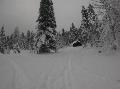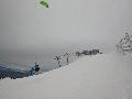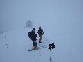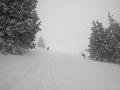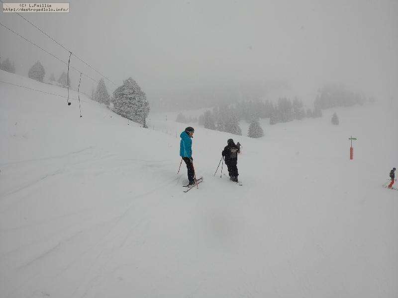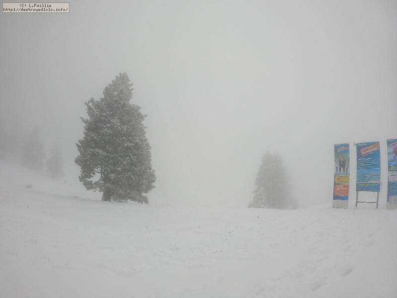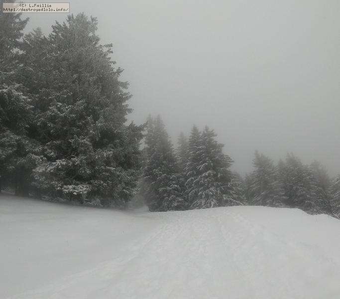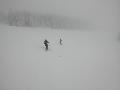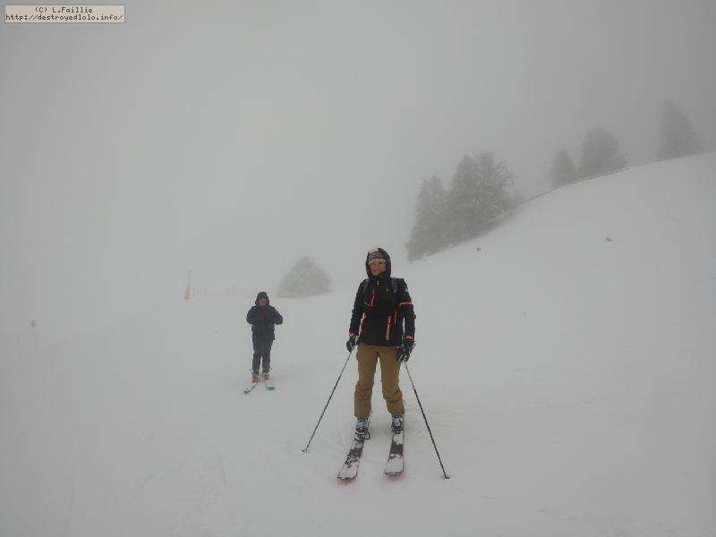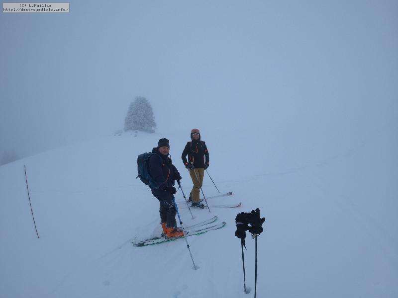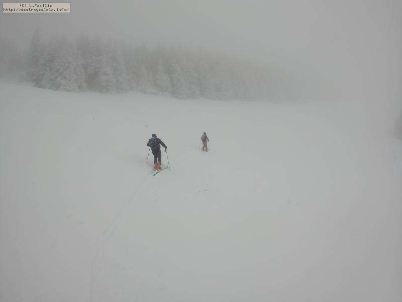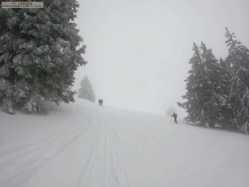 Brouillard et flocons ne nous empêcheront pas de tester ma glisse ... ben elle est très moyenne. 1h30 et plus aucune pêche. Etrangement, ça passe mieux en rando : sans doute que ce n'est pas les mêmes muscles.