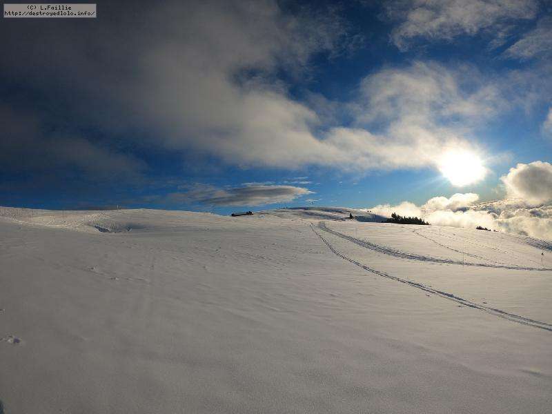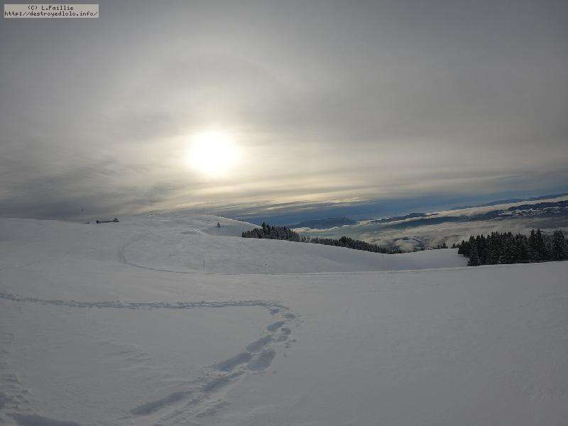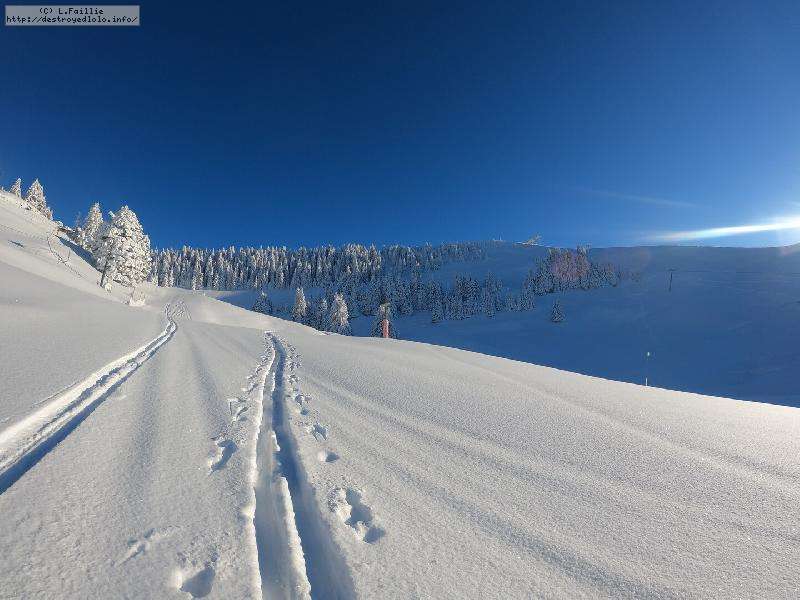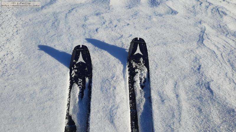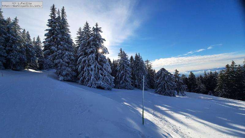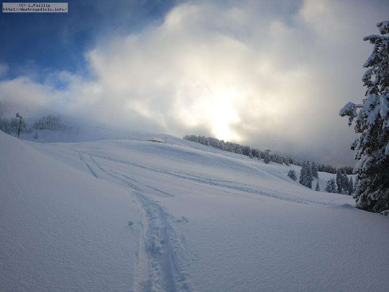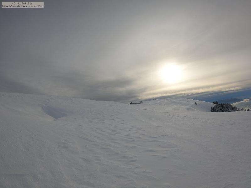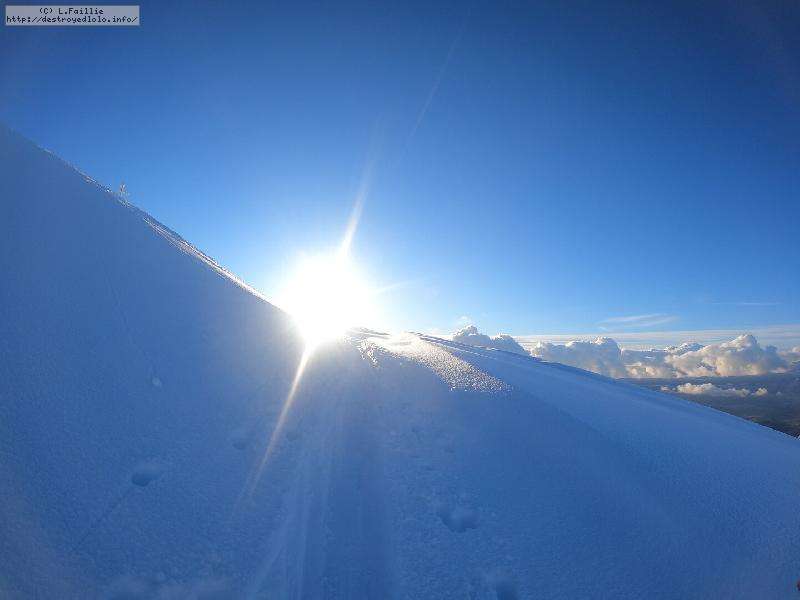 Tempête de soleil avec les quelques centimètres qui sont tombés la veille. Un peu de vent au sommet et des nuages qui arrivent en fin de journée : ça sera la peuf des jours qui viennent.