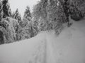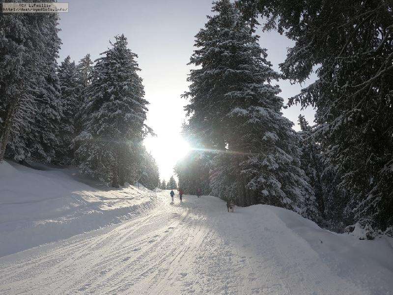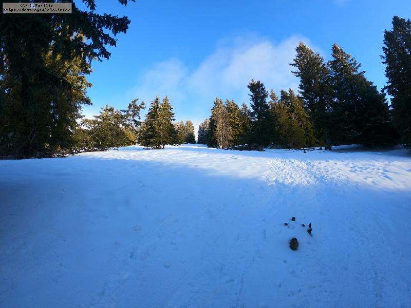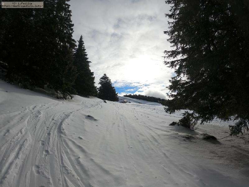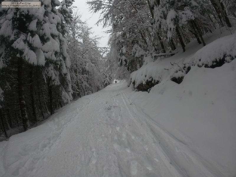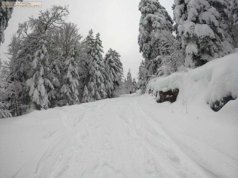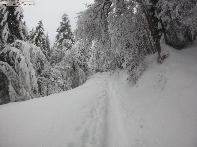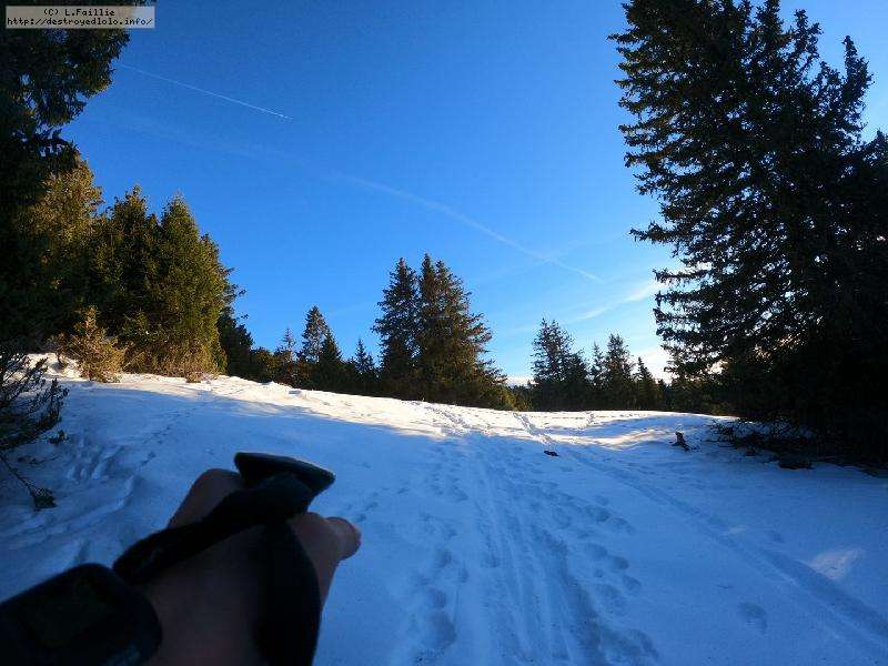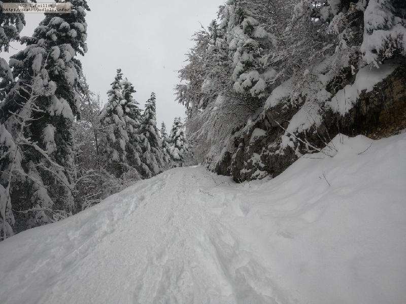 Si le chemin est intéressant pour une balade, il l'est moins pour le côté ski pur : très plat (j'y reviendrais), aucune difficulté ... ce qui fait qu'au bout de quelques kilomètres, un sentier de randonnée part sur la droite. Comme il y a des traces de ski, je le prends en sachant qu'il sera impraticable pour la descente (trop escarpé, trop de rocher, ...) : il rejoint plus loin le chemin, c'est parti pour une boucle de 10km.