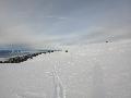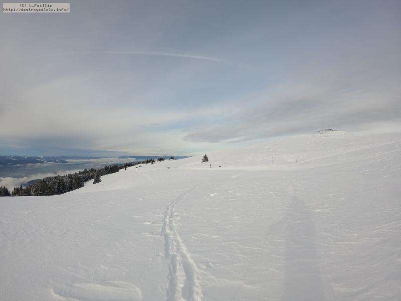 Si on trace majoritairement dans de la bonne fraiche comme on l'aime, il y a une sorte de sous-couche plus lourde en dessous qui fait qu'à aucun moment je n'ai touché, même si c'est plus limite sur la crête qui a été un peu soufflée. Mais vu le manque de visibilité, je ne regrette pas d'avoir choisi les raquettes ... même si ça devait passer en ski : il y avait des traces et elles ne perçaient pas. En descente faut quand même éviter les crêtes et les parties caillouteuses.