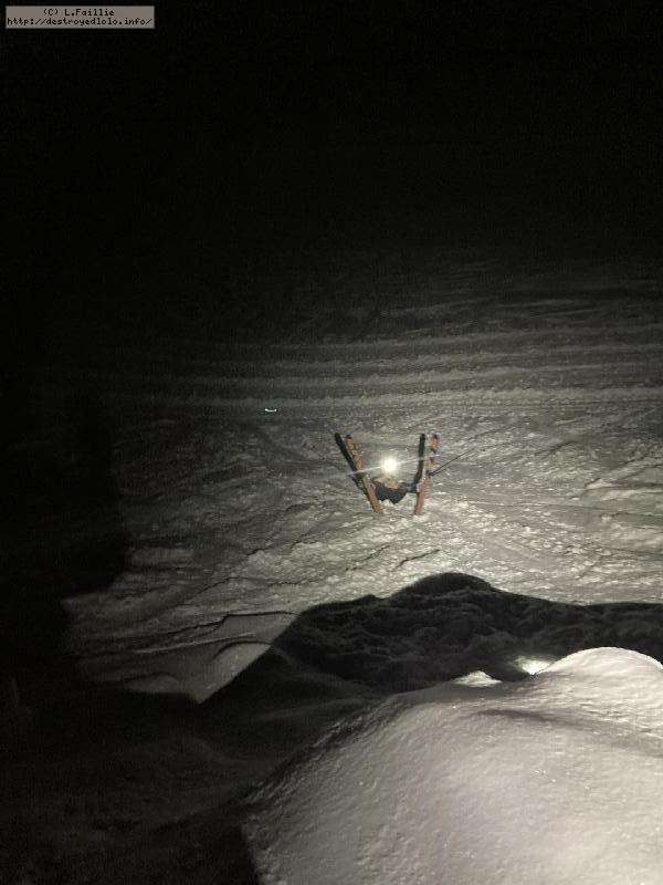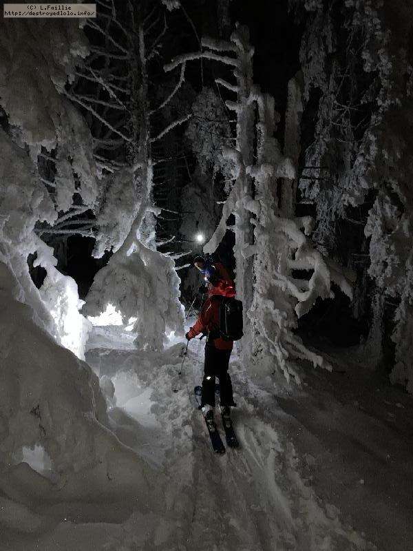 On commence à ne plus y voir grand-chose (et la frontale est bien évidemment restée à la maison) : par "sécurité", je redescends par Sapinettes. N'ayant pas été damée, entre les congères et les touffes d'herbes, elle tient plus à Verdun qu'à une vraie piste. Par contre, le bas est vraiment excellent !