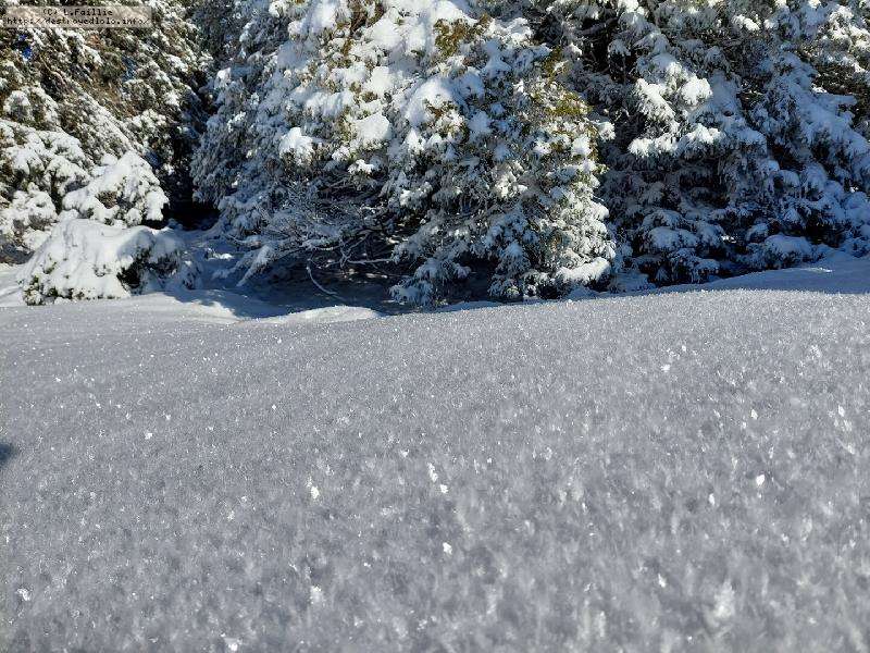 S'il a fait très chaud ces derniers jours (d'en bas, on voyait les coulées et la terre), il a bien peuffé cette nuit : une bonne pelletée de centimètres de poudre ... qui ne fait qu'illusion, car les requins ne sont pas loin. Malgré tout, la glisse reste très bonne.