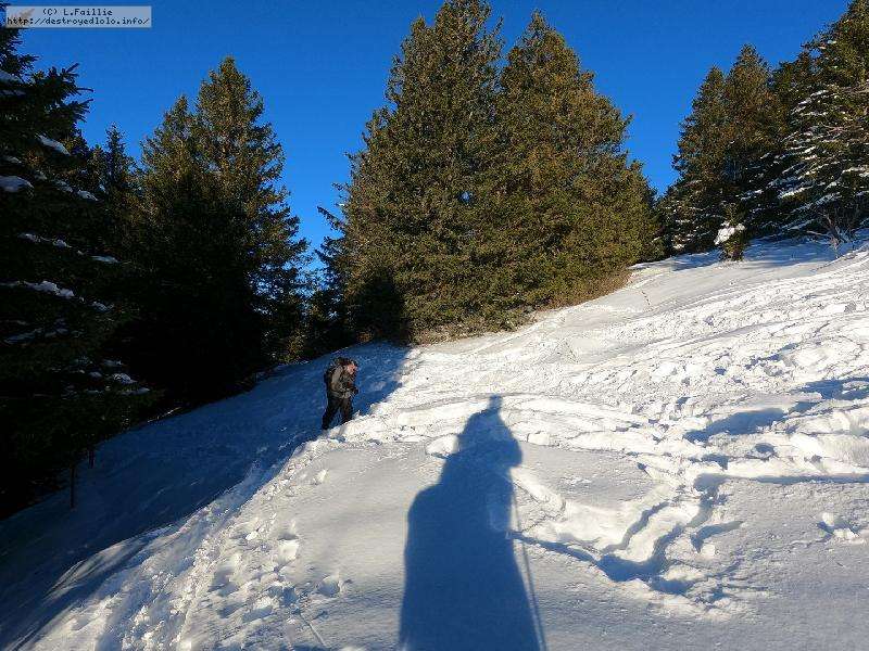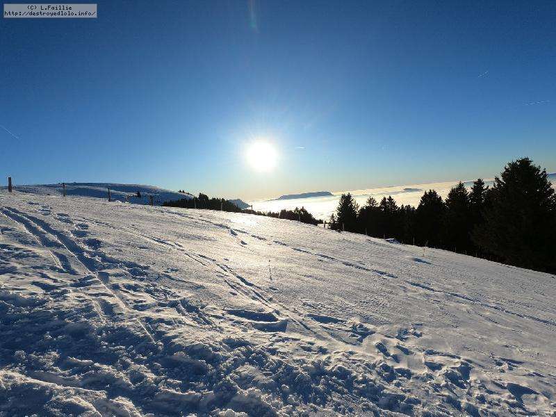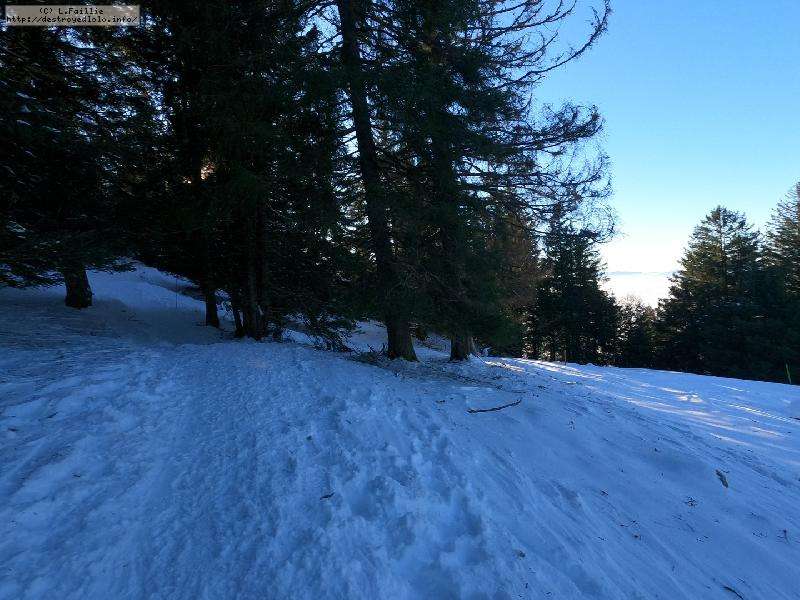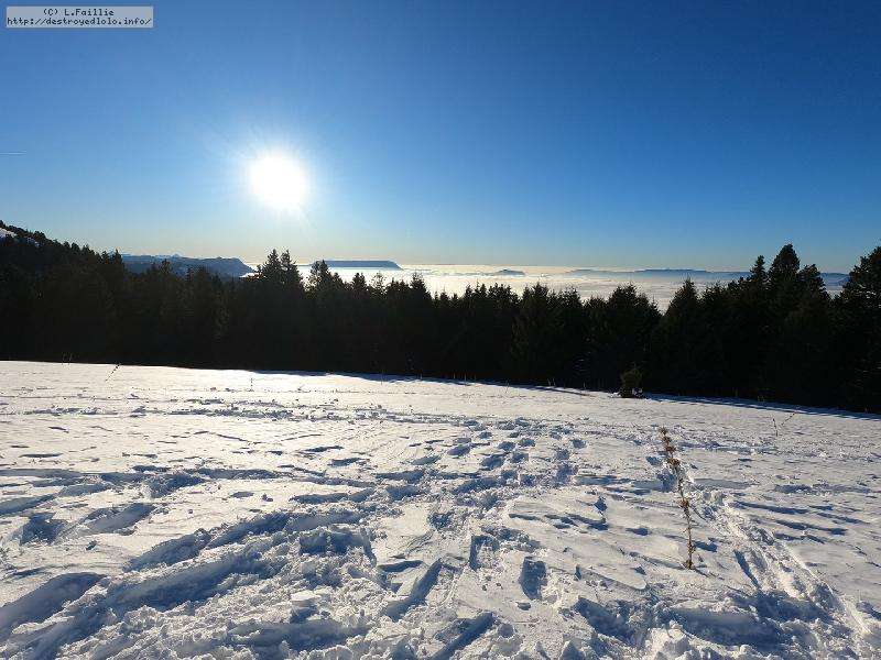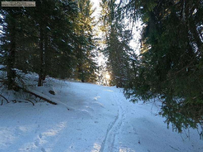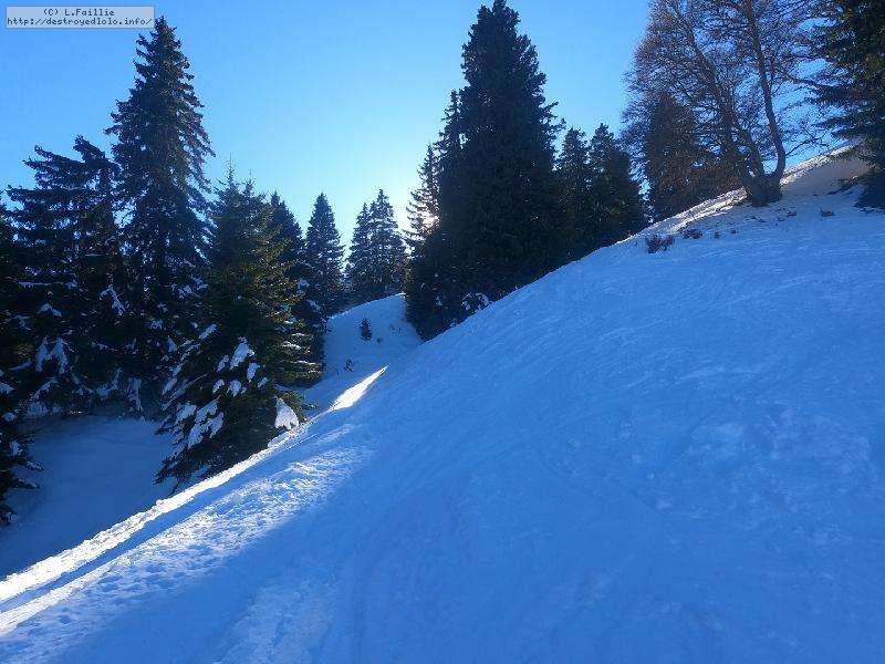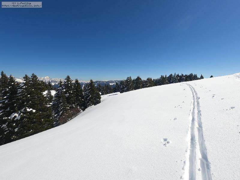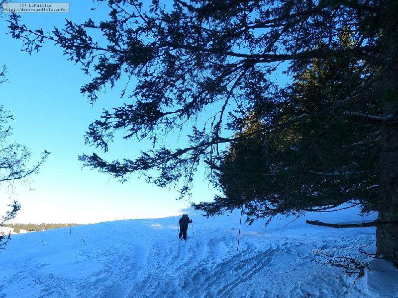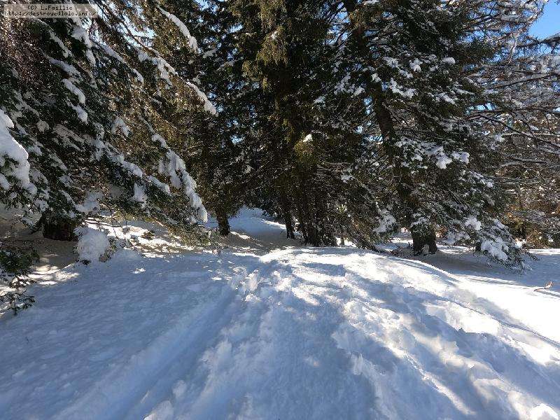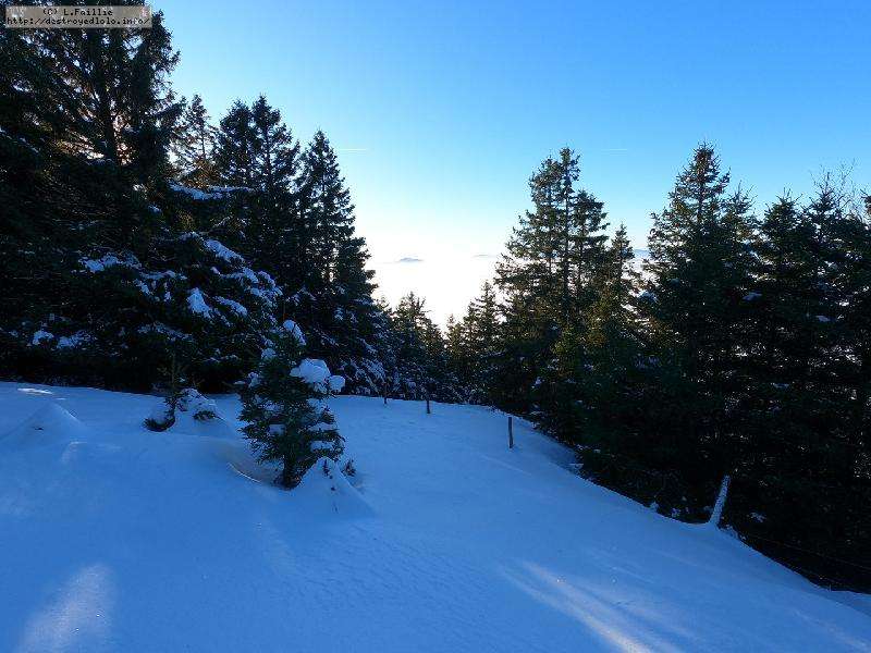 Je monte par la piste "raquette" (avec une bonne dose de hors piste) jusqu'au crêt de l'Aigle : la neige est lourde, collante, il faut dé-saboter souvent. La couche est suffisante pour ne pas toucher (sauf au crêt lui-même).