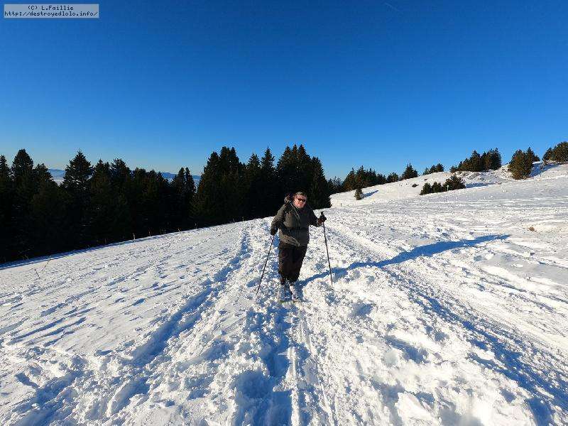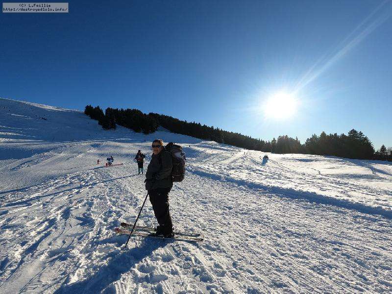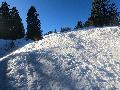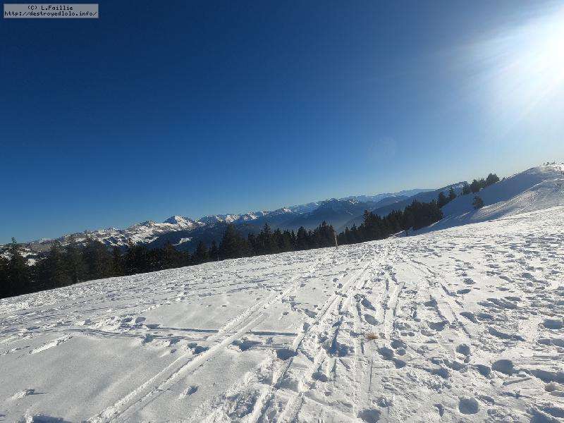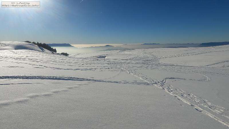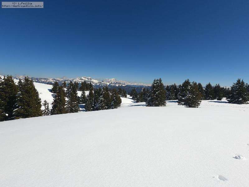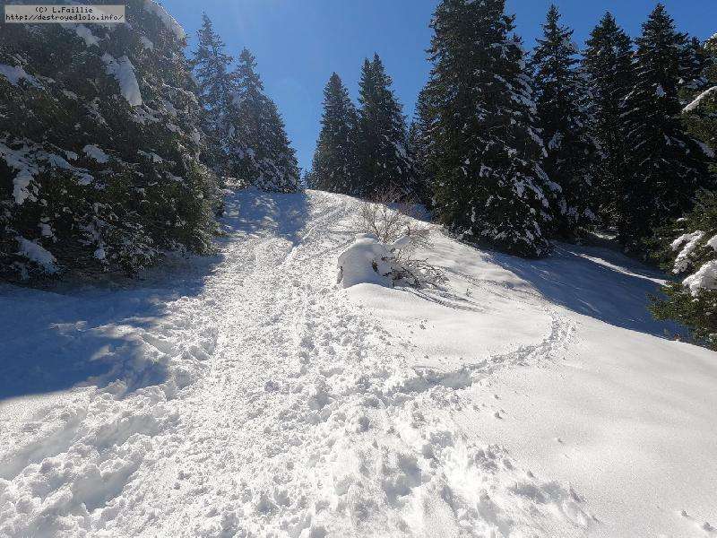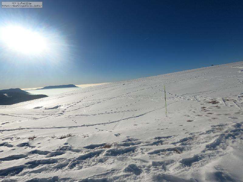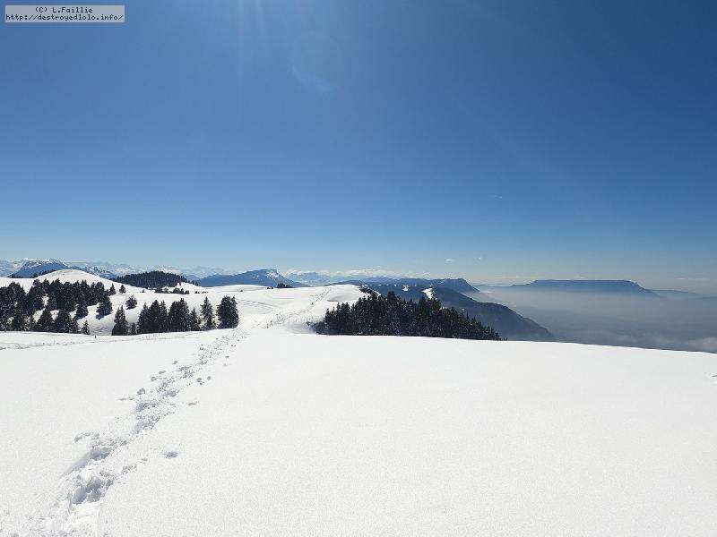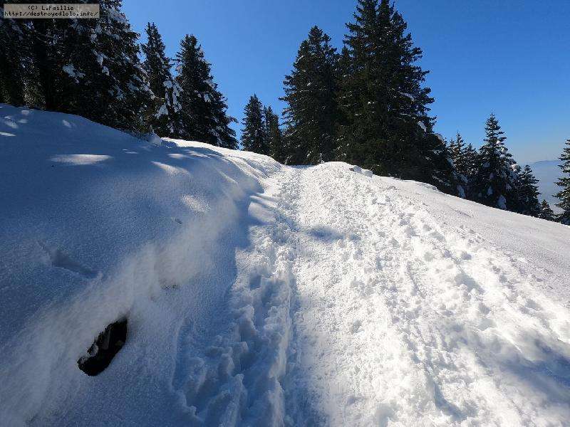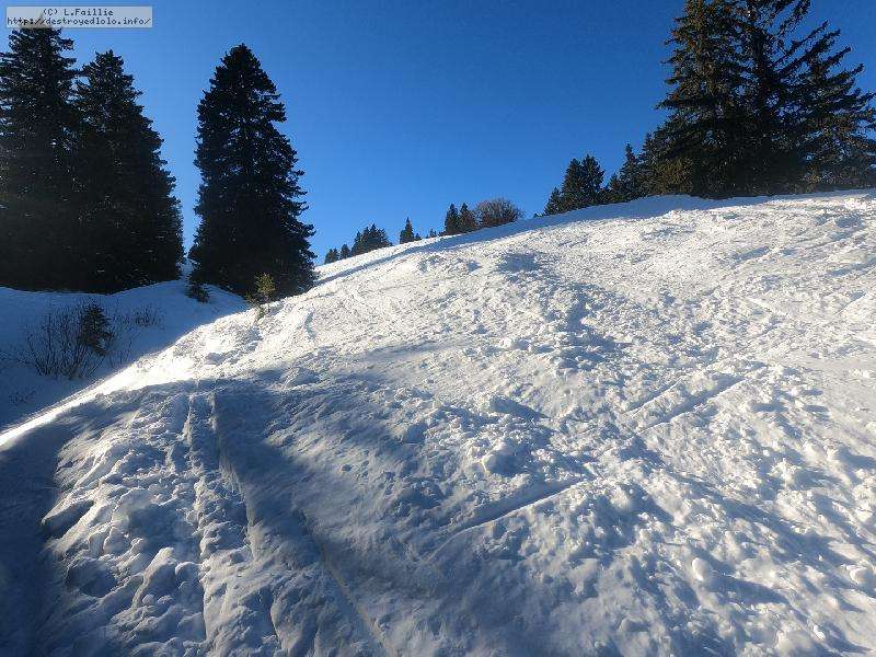 Je monte par la piste "raquette" (avec une bonne dose de hors piste) jusqu'au crêt de l'Aigle : la neige est lourde, collante, il faut dé-saboter souvent. La couche est suffisante pour ne pas toucher (sauf au crêt lui-même).