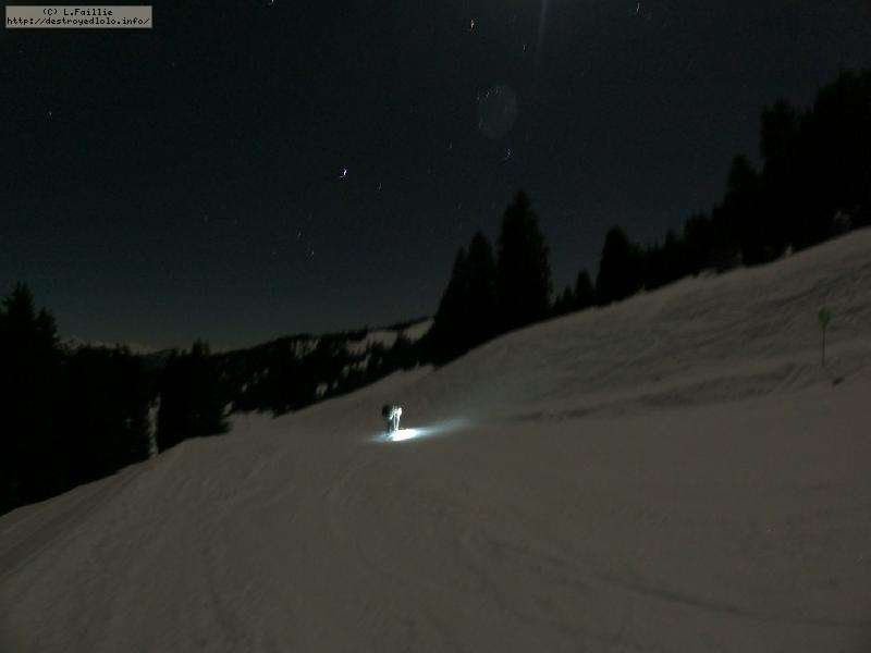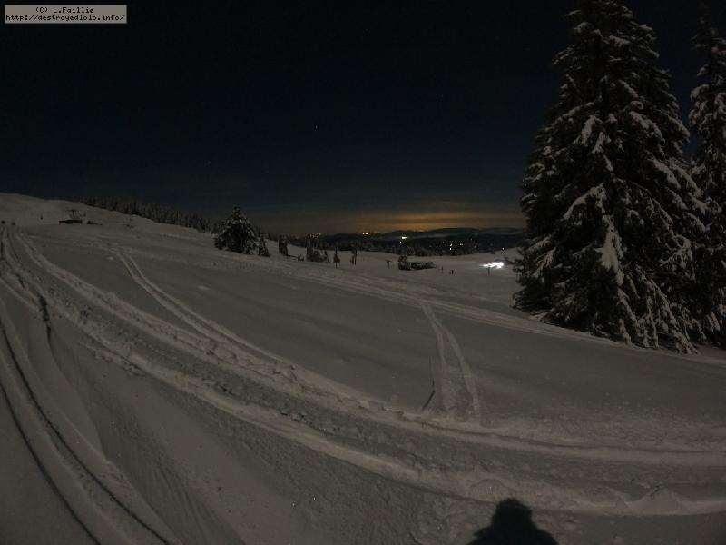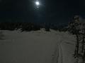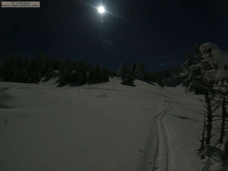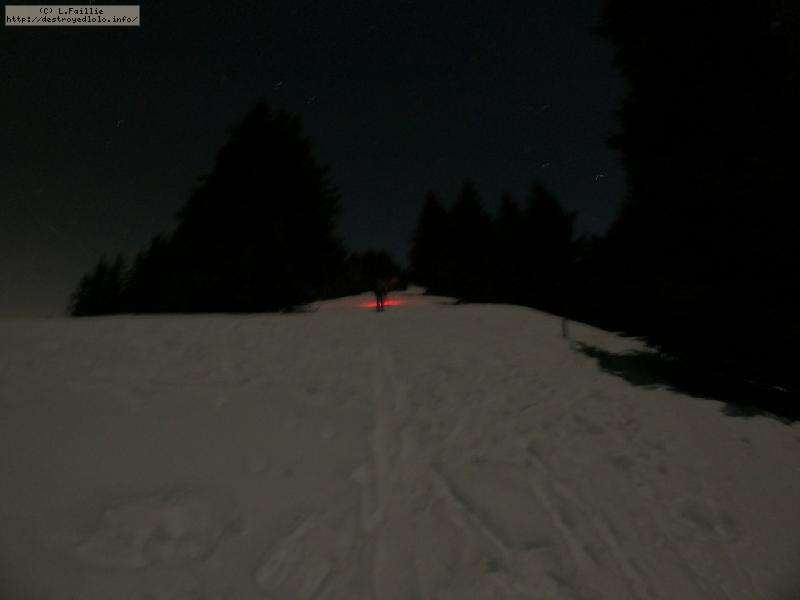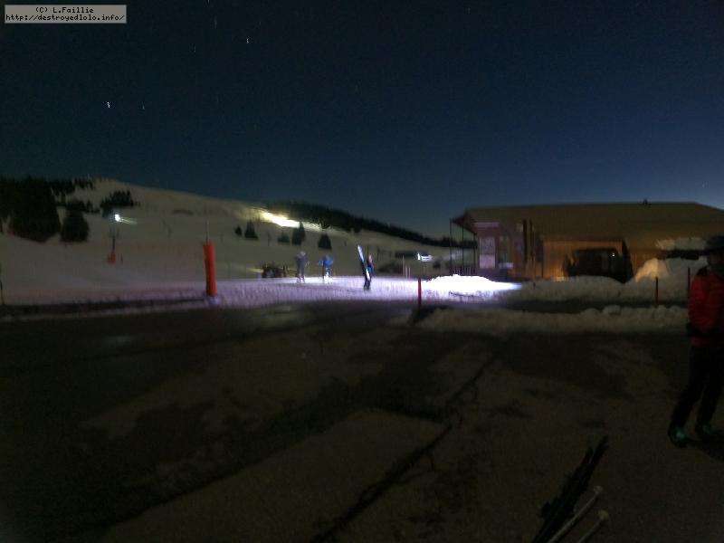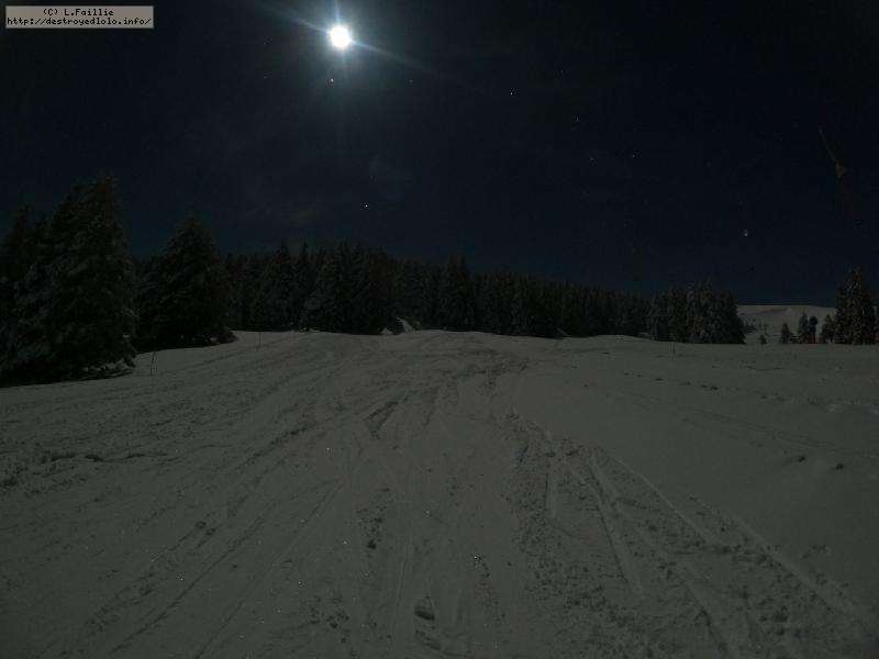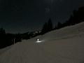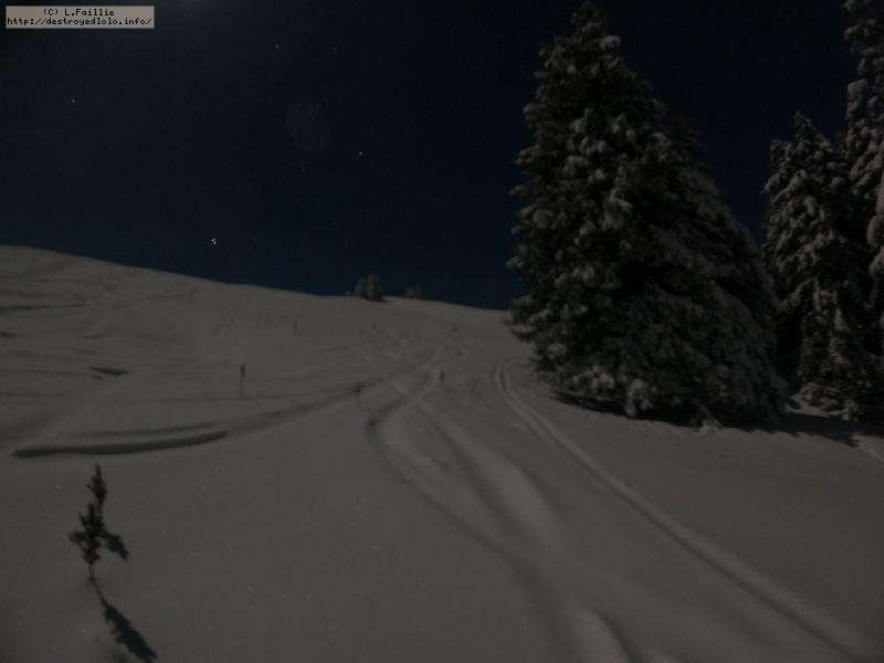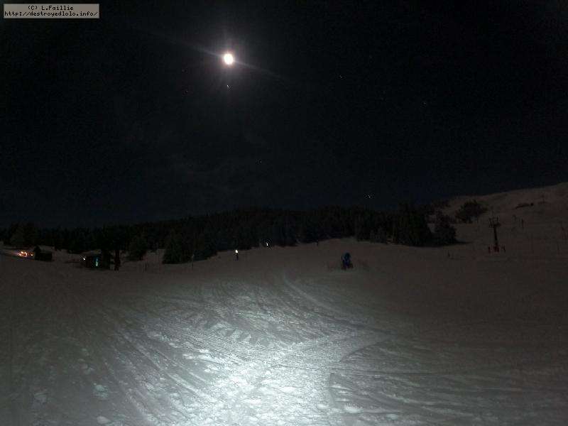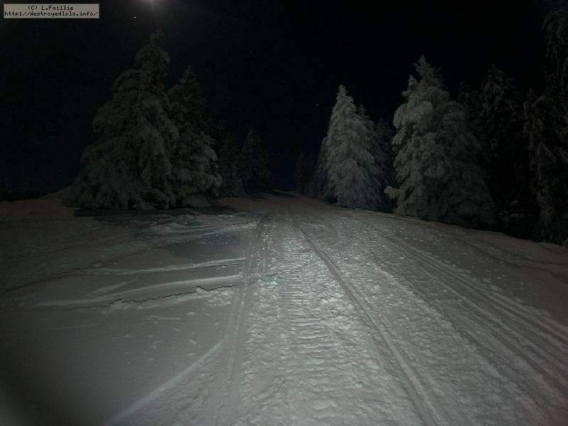 Sortie décidée au dernier moment avec une amie et un collègue ... Départ à 19h30 ... bien trop tard pour le coucher de soleil, mais "beaucoup" de monde (pour l'heure) : au moins une 15e de personnes !!! Sans compter le service des pistes, car ça dame partout : du coup, on monte par la "trace" raquette/rando sur le bas de "bucheron" où nous serons seuls, l'autre groupe qui part en même temps que nous passe par le domaine skiable.