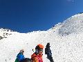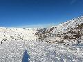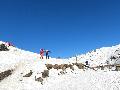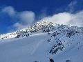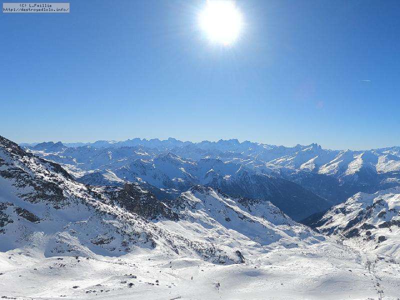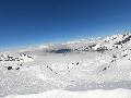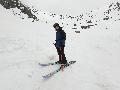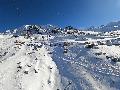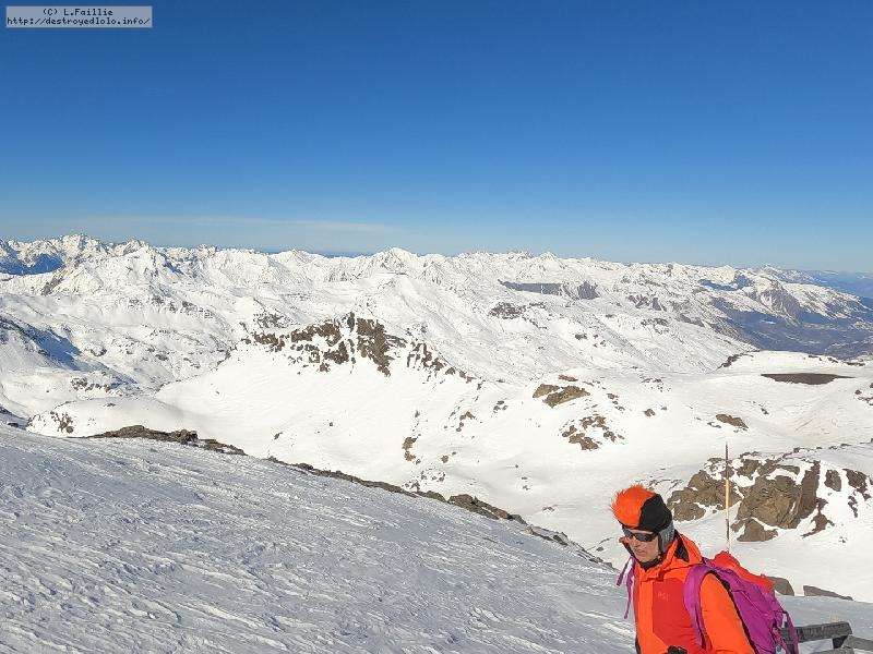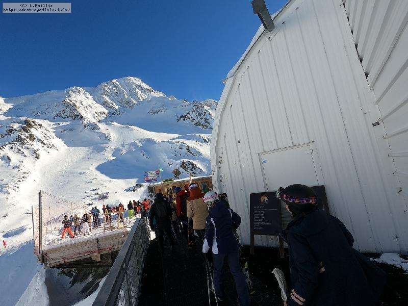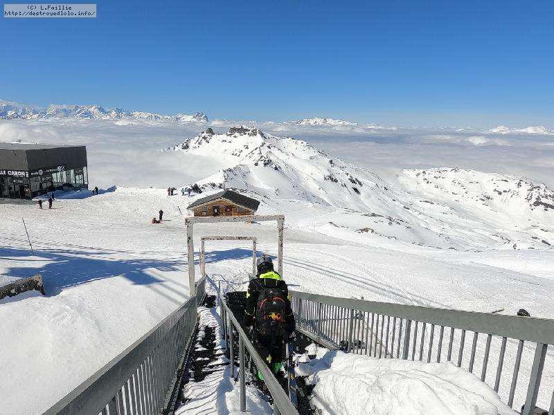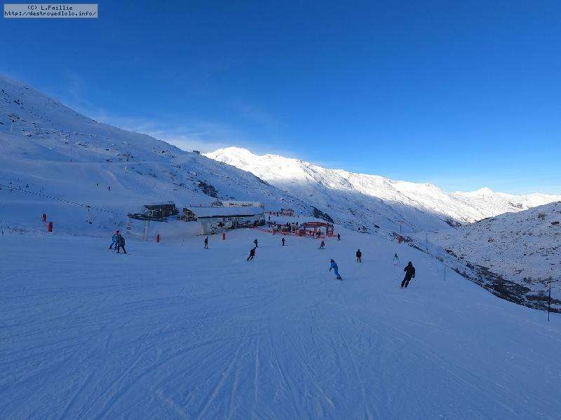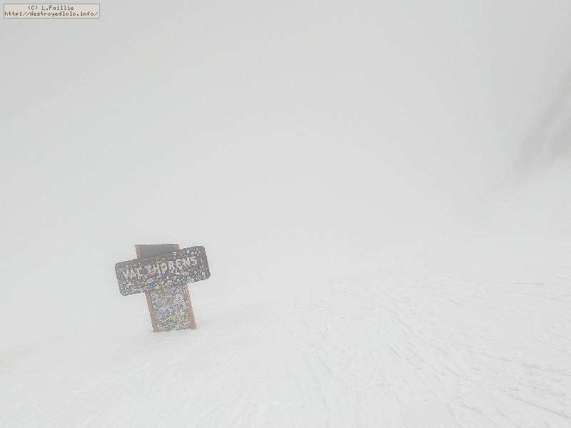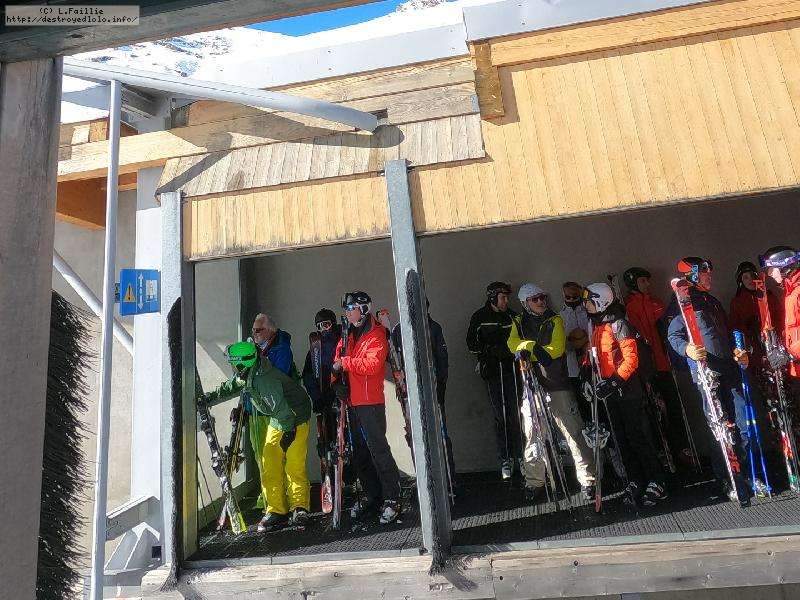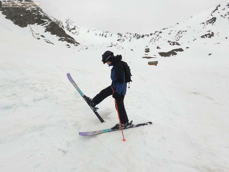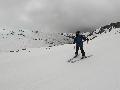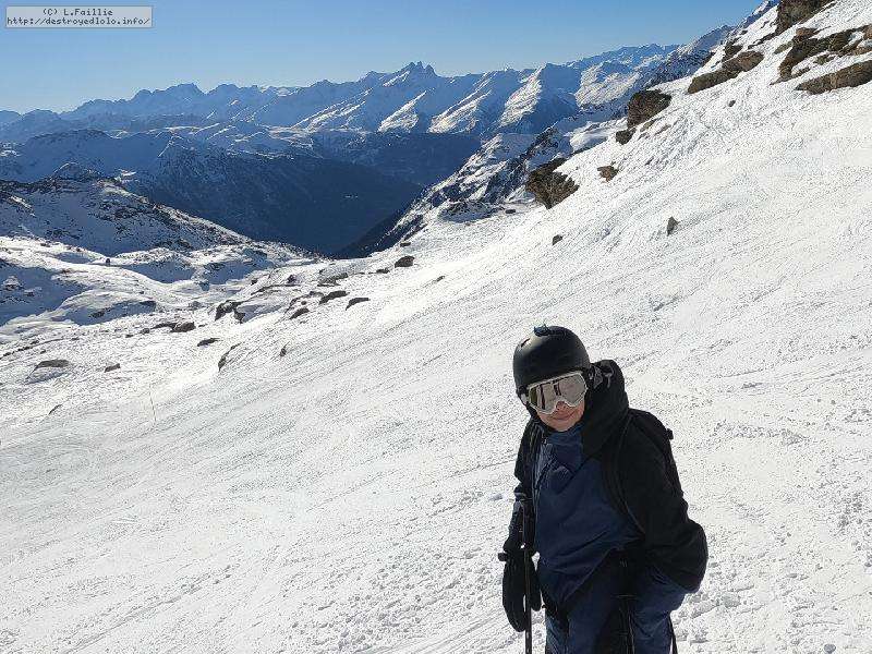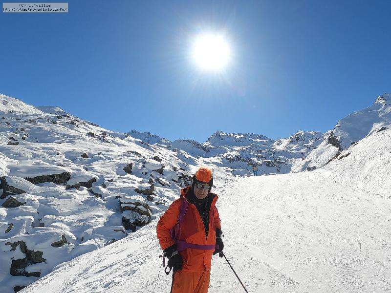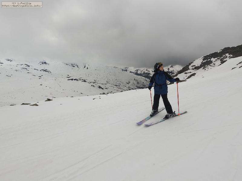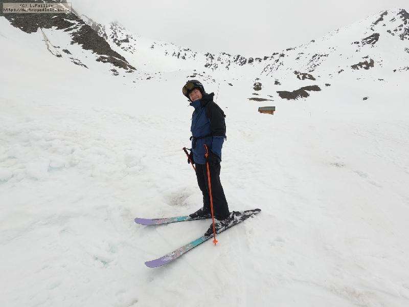 La météo est annoncée comme ... changeante : suivant quand on regarde, ça oscille entre beau et tempétueux. La réalité sera entre les 2 avec un vent notable sur le haut mais pas dérangeant. Par contre, l'arrivée fait très peur car c'est tapi vert jusqu'à l'arrivée au cirque de la station. Et même si la couche ne sera pas transcendante, elle reste suffisante pour ne pas ruiner ses skis sur les requins.
