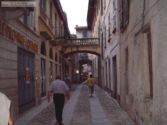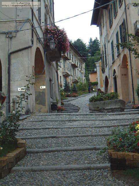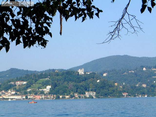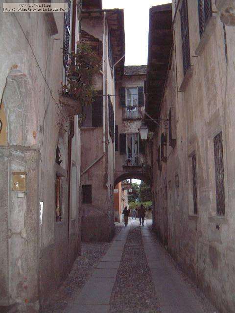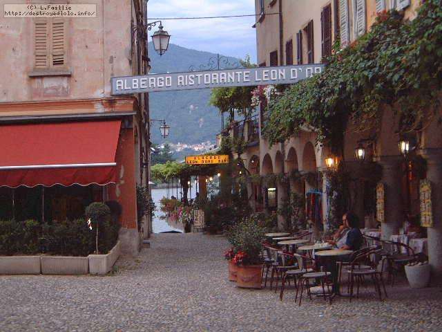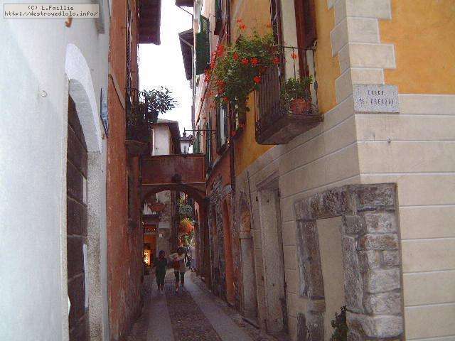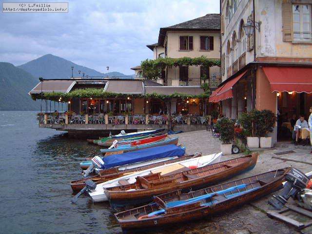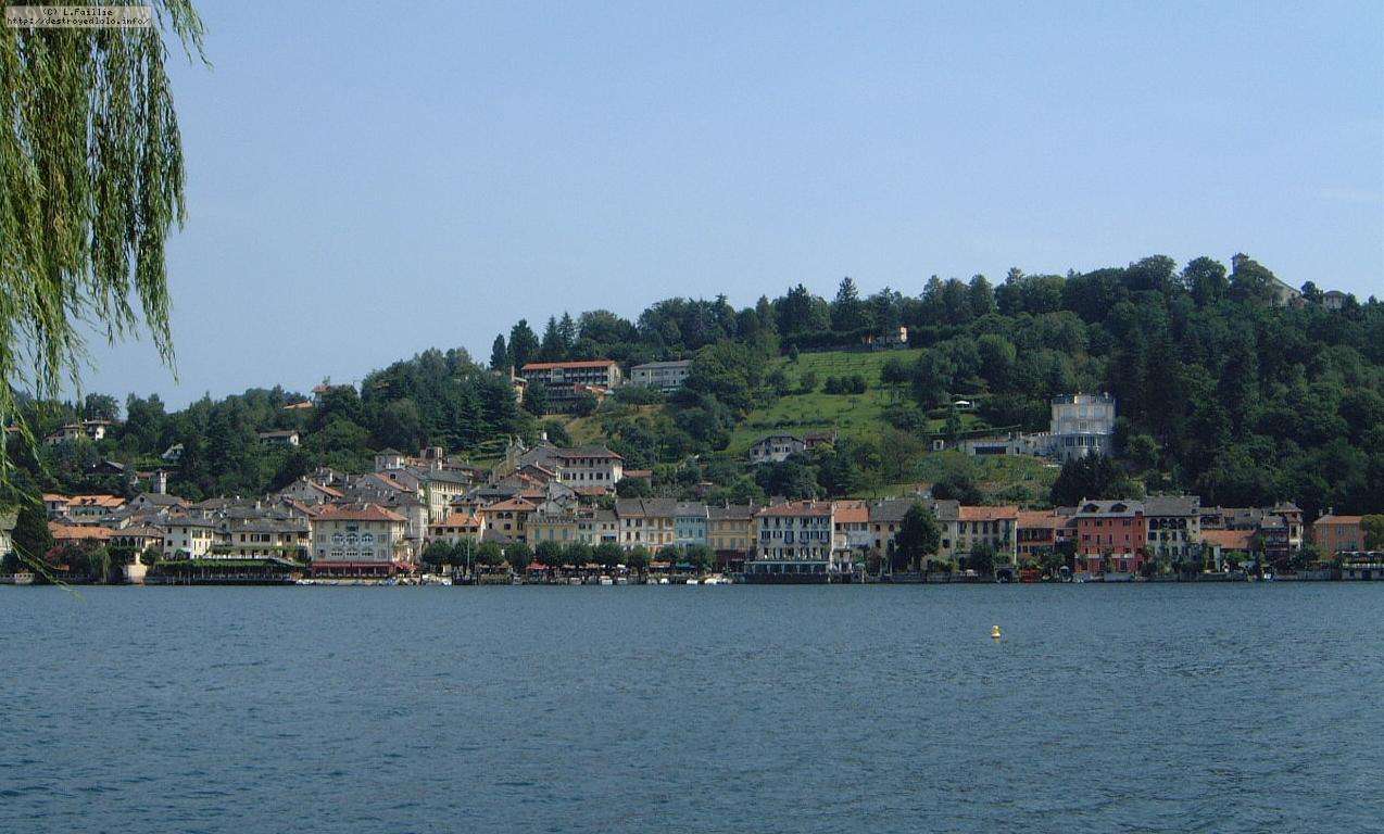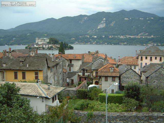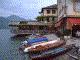 accroché aux flancs d'une péninsule : le mont sacré. On ne peut pas se tromper : le village est entièrement tourné vers le tourisme. Magasins de souvenir et restaurants se succèdent mais, heureusement, ça n'a pas trop détérioré l'ambiance du village. Dommage que certains détails, à commencer par le parking, font qu'on se demande si on ne prend pas le touriste uniquement pour un porte feuille ambulant. Le centre est vraiment très romantique : on descend des hauteurs par une rue-escalier pour arriver sur une place qui fait aussi office de port. Comme dans beaucoup de villages de la région, certaines maisons arborent de belles fresques, et tout est fleuri, aidé en cela par une végétation luxuriante. A la tombée de la nuit, les lampions donnent un éclairage qui accentue encore la beauté du site et met en valeur le lac. |