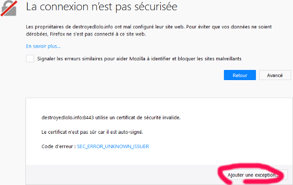 Il est temps de tester notre site depuis un navigateur : celui-ci n'aime pas les certificats auto-signés, mais une fois une exception mise en place, ça fonctionne.