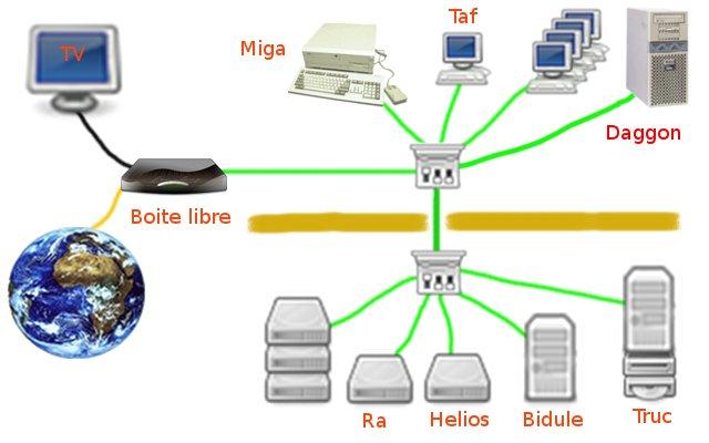 Ma freebox (nommée ... "boite libre") donne accès à internet et fourni une protection minimale au reste du réseau. Elle est aussi reliée à la TV familiale et est donc une petit centre multi-média à bon compte. Je dédirais un billet sur sa configuration.