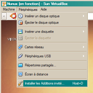 laurent@Nunux:~$ sudo bash root@Nunux:~# cd /media/cdrom0 root@Nunux:/media/cdrom0# ./VBoxLinuxAdditions-x86.run Verifying archive integrity... All good. Uncompressing VirtualBox 3.0.6 Guest Additions for Linux installation................................................................................................................................................................................................................................ VirtualBox 3.0.6 Guest Additions installation Building the VirtualBox Guest Additions kernel module... Building the shared folder support kernel module... Building the drm support kernel module... Installing the VirtualBox Guest Additions... Successfully installed the VirtualBox Guest Additions. You must restart your guest system in order to complete the installation. root@Nunux:/media/cdrom0#