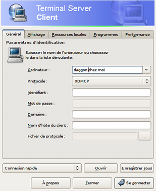 Dans le menu Internet d'Ubuntu, Terminal Serveur Client permet de se connecter à une machine distante. Il faut installer xnest pour qu'il accepte xdmcp.